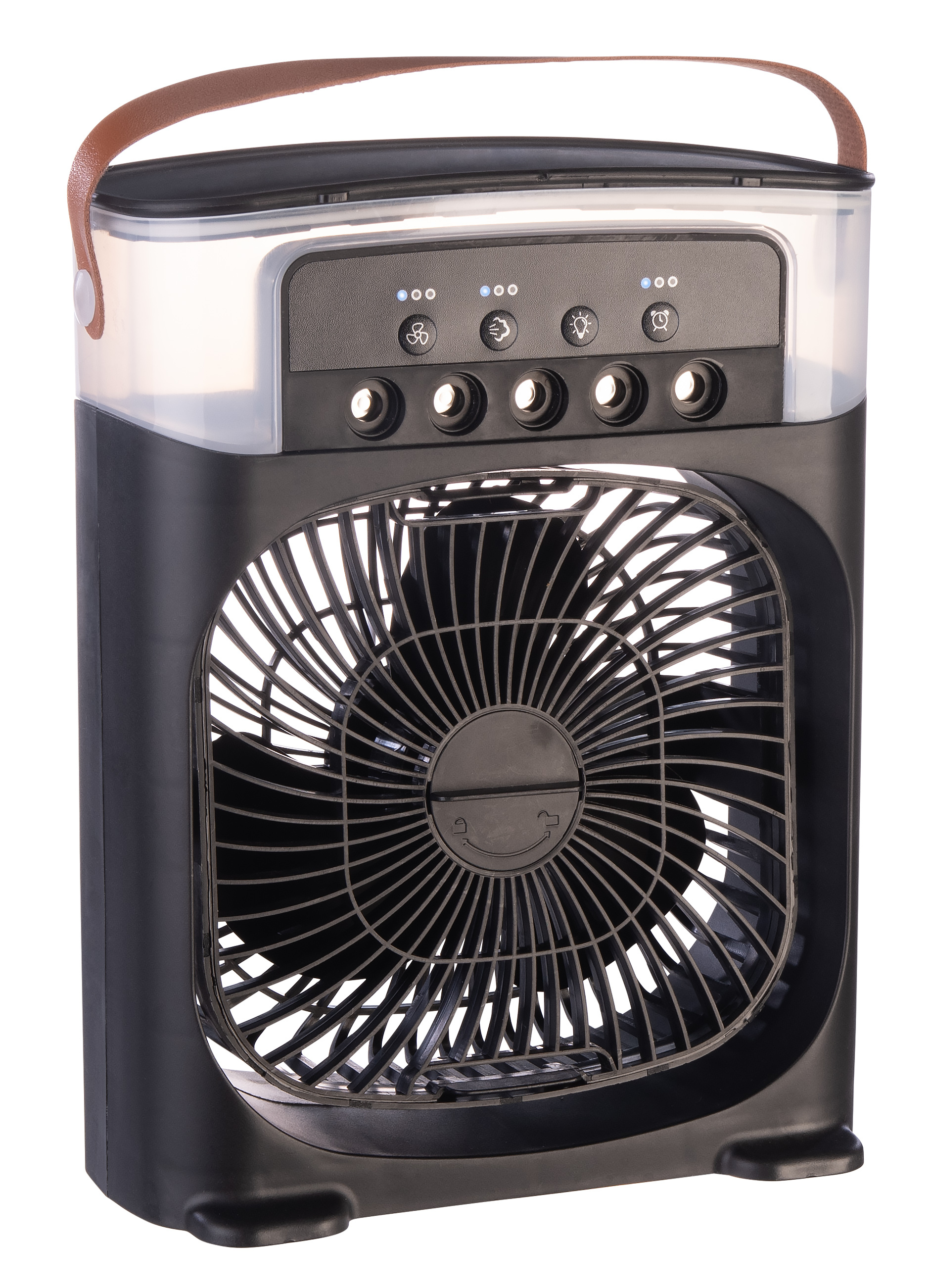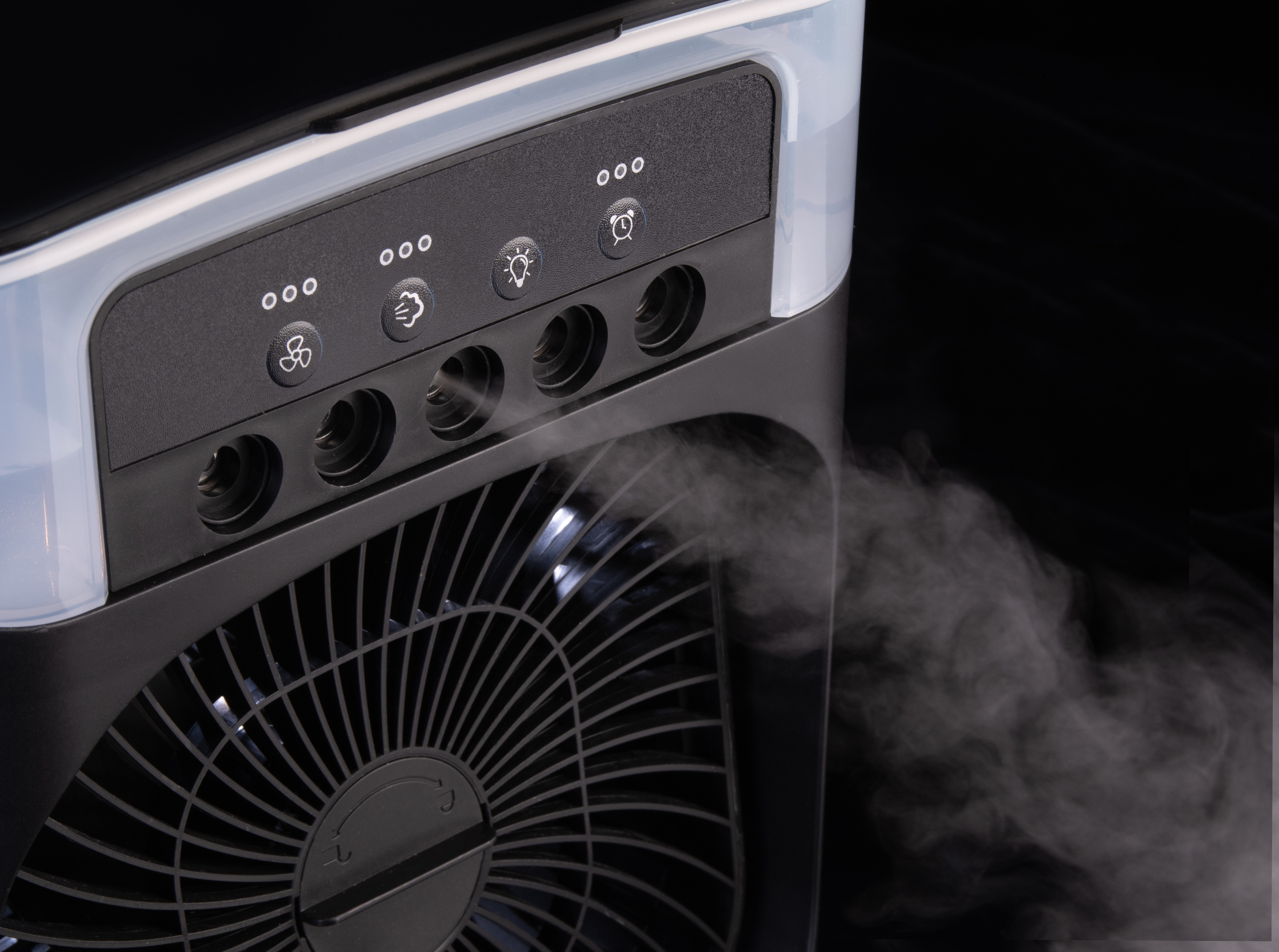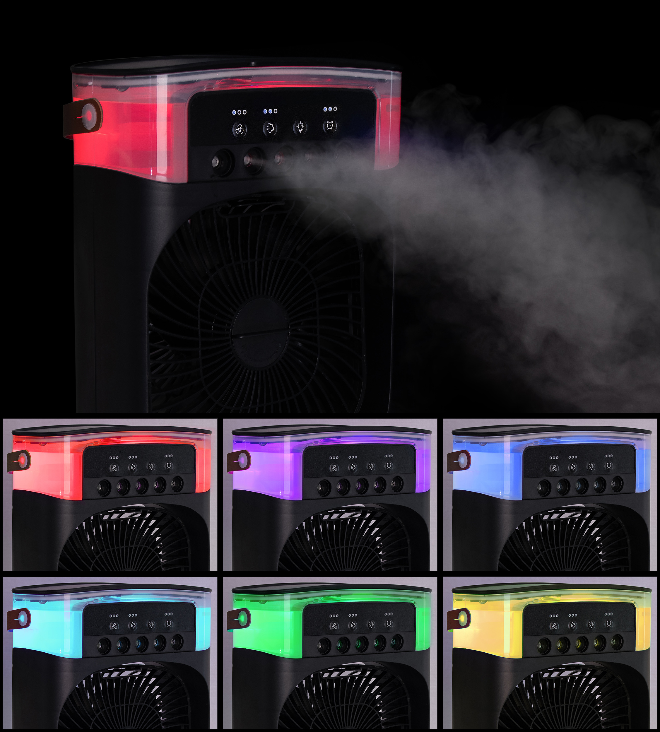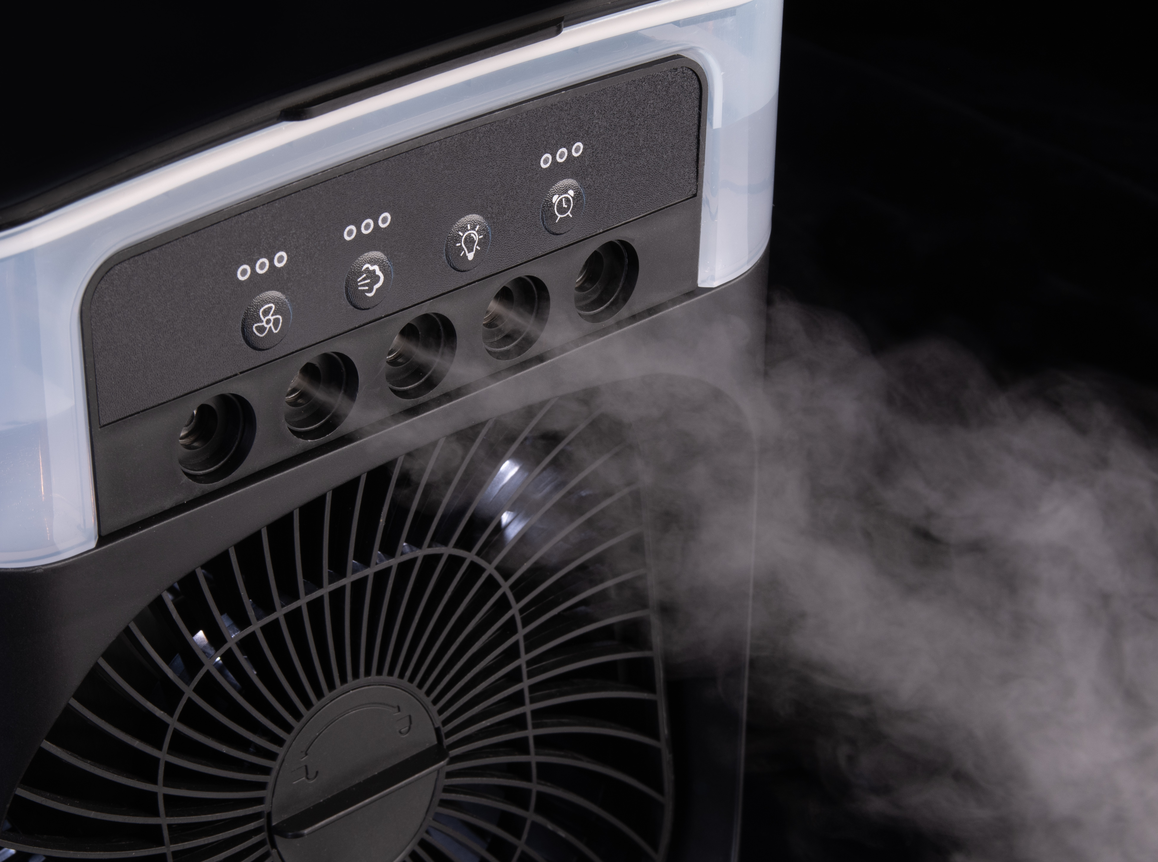 Der Ventilator kann multifunktional eingesetzt werden. Es stehen jeweils drei Gebläse- und Sprühstufen zur Auswahl, um die passende Einstellung zu finden. Zusätzlich kann der Tischventilator als Nachtlicht mit verschiedenen Leuchtfarben genutzt werden. Eine Timerfunktion ermöglicht das automatische Abschalten des Gerätes nach der gewünschten Zeit.