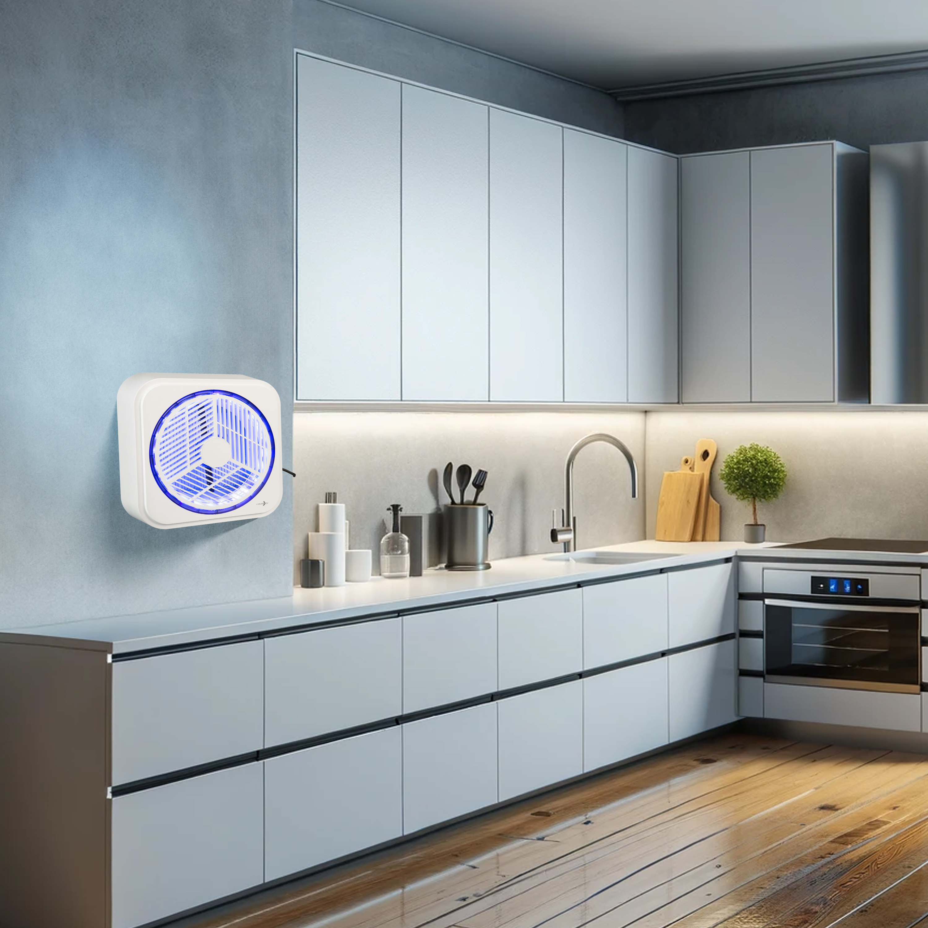 Das ultraviolette Licht lockt Insekten an, die beim Kontakt mit dem berührungssicheren Hochspannungsgitter durch einen Stromschlag getötet werden. Das Schutzgitter gewährleistet die Sicherheit von Kindern und Haustieren.