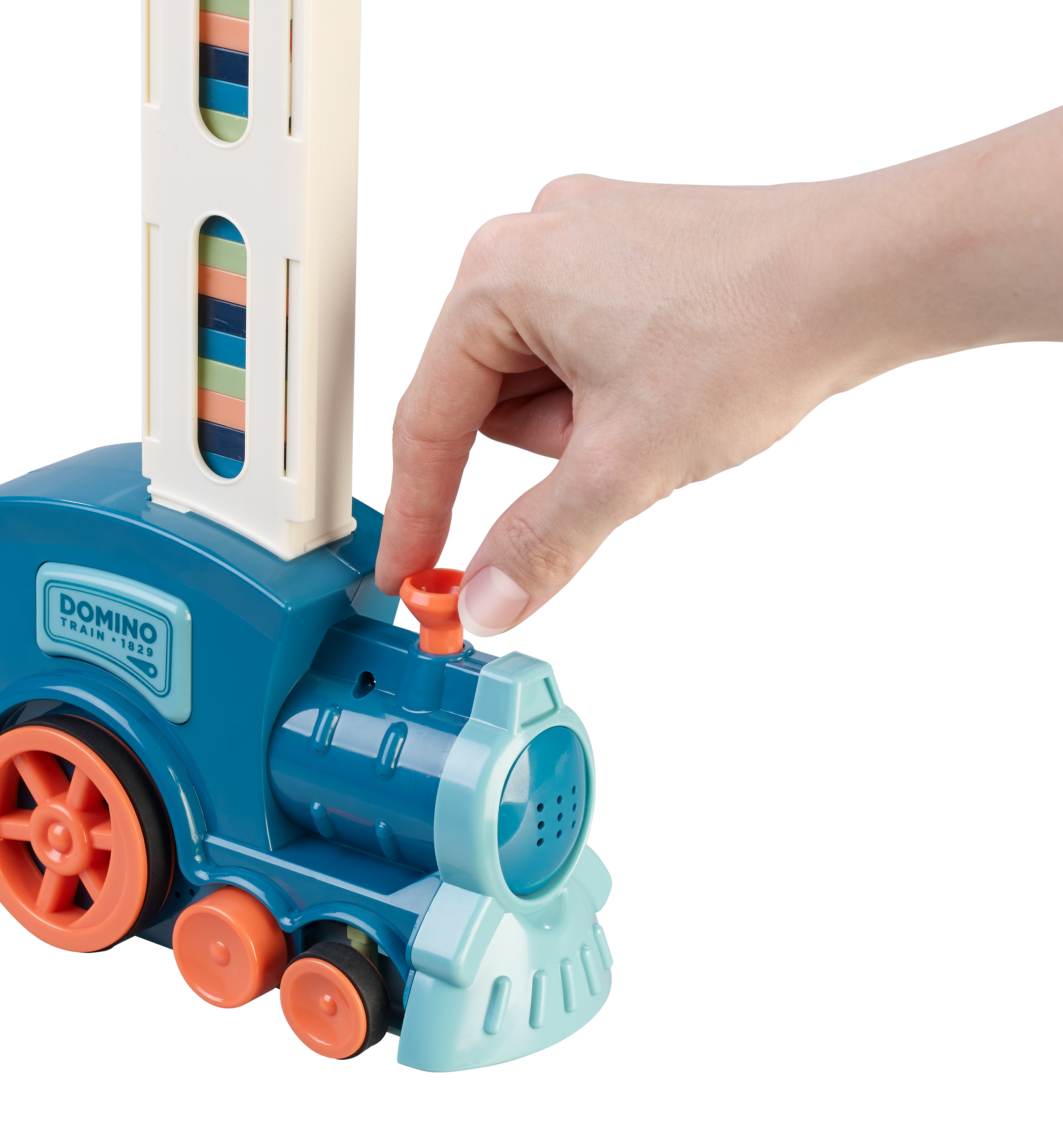Faszinierende Licht- und Ton-Effekte: Die Dominosteine werden in den Steinhalter geladen und am Zug befestigt. Der Domino-Spielzeug-Zug von Playtastic fährt automatisch und stellt die Dominosteine in einer Reihe auf.