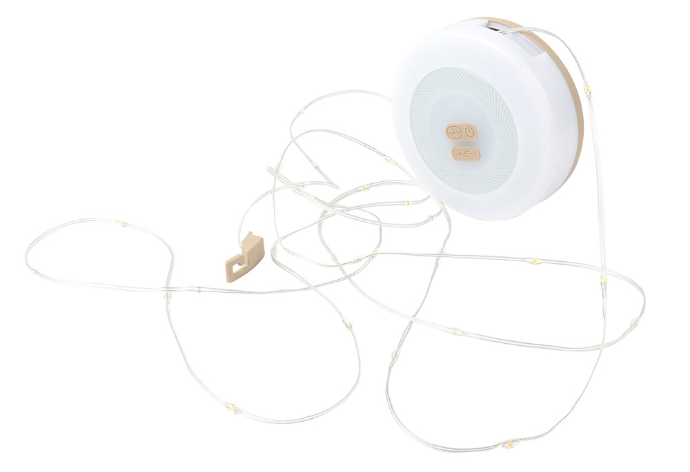 Die 10 Meter lange Lichterkette lässt sich nach Gebrauch mühelos per Handkurbel aufrollen und sicher im Inneren der Leuchte verstauen. Leuchte und Lichterkette können einzeln oder zusammen verwendet werden, die Helligkeit sowie einer der drei Leuchtmodi der Lichterkette sind flexibel einstellbar.