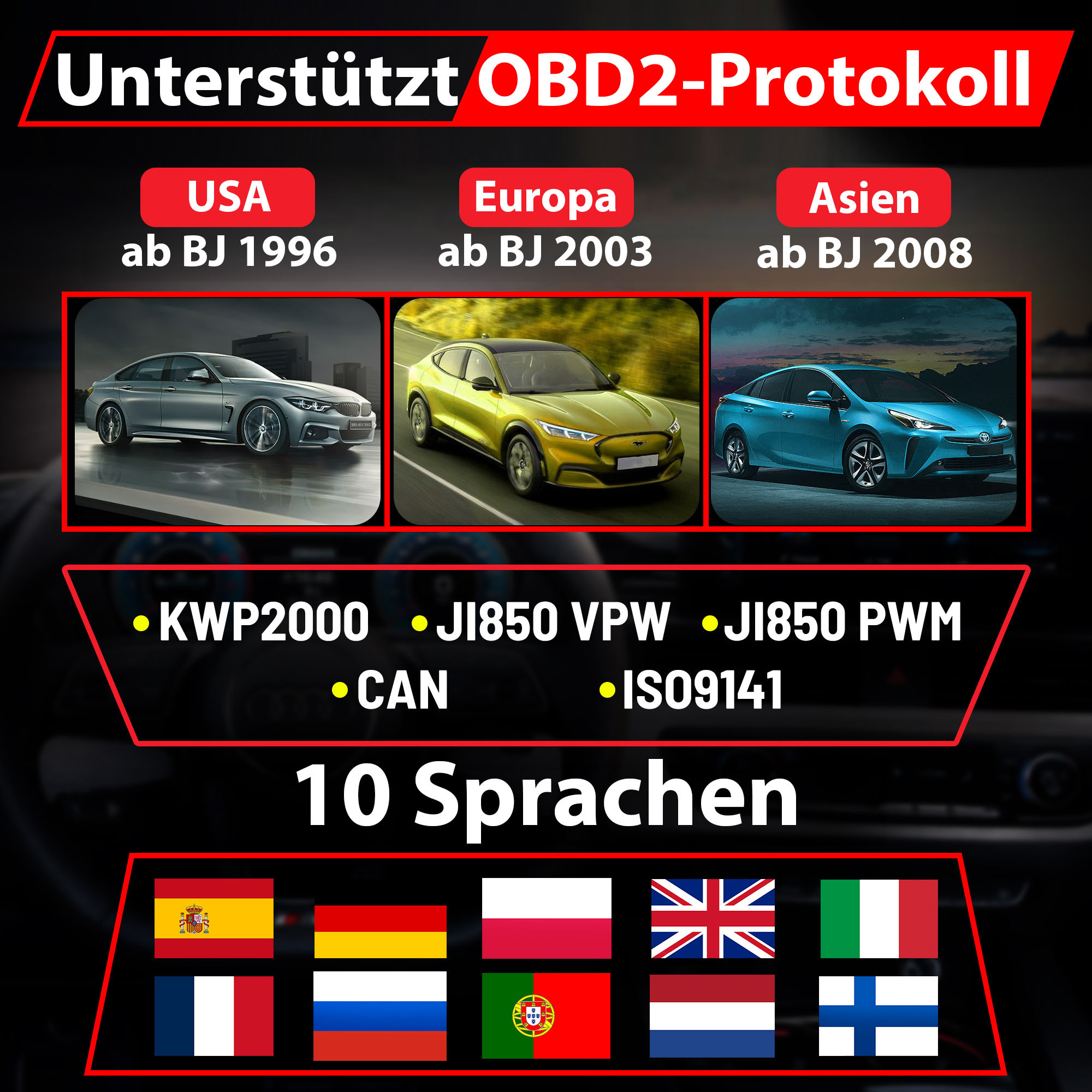 Es ermöglicht das Erkennen und Auslesen von allgemeinen und fahrzeugspezifischen Fehlercodes und unterstützt gängige Protokolle wie ISO 9141, KWP2000, SAE J1850 und CAN.
