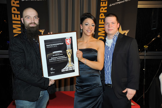 Am 6. Januar wurden die Sieger beim Gastronomiepreis Hessen 2013 im Main Nizza in Frankfurt ausgezeichnet. Selvana Hautmann überreicht die Urkunde an Küchenchef Norman Wegner (links) und Sous Chef Christian Beck (rechts). Foto: Gastronomiepreis 2013