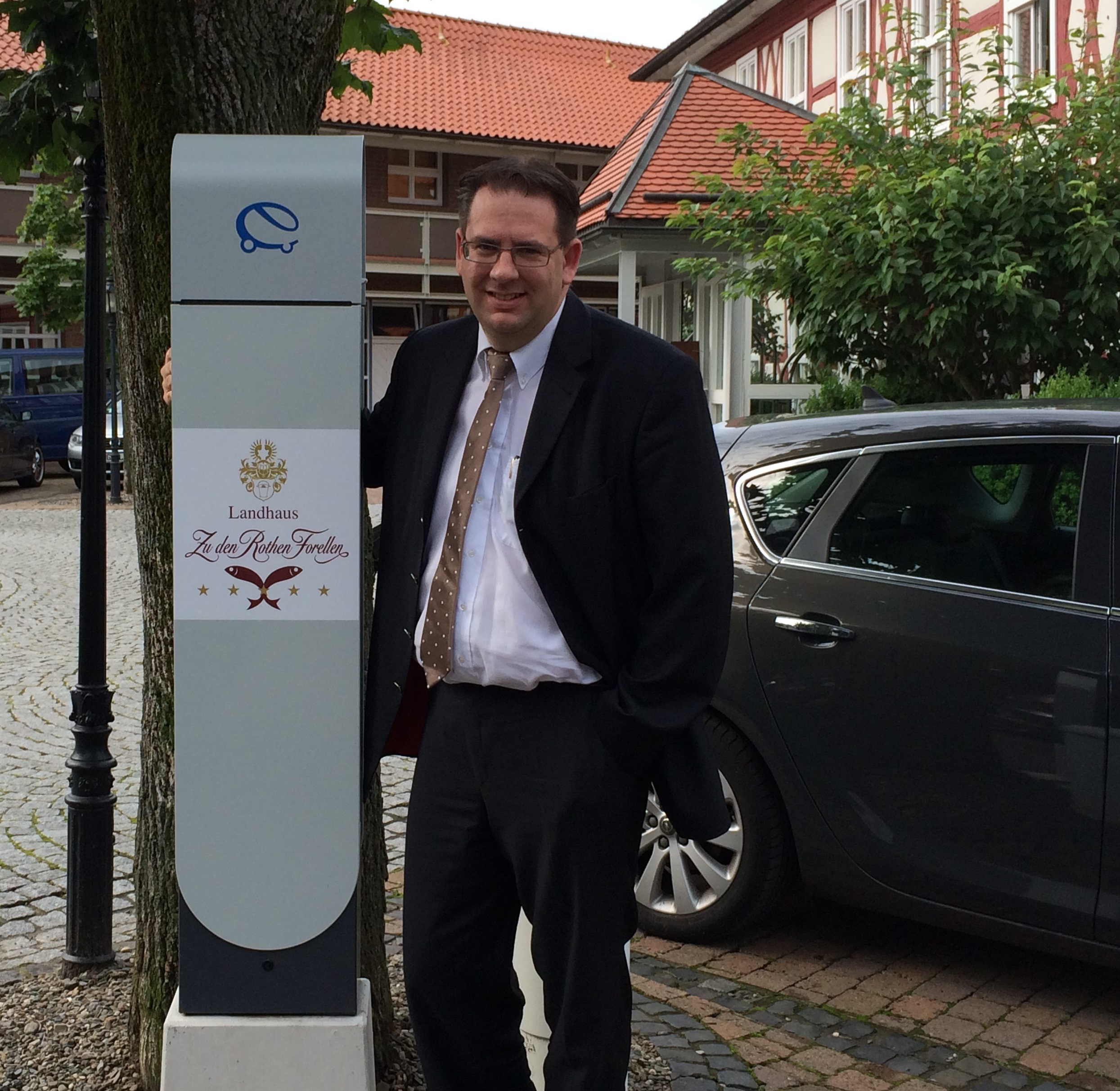 Sebastian J. Ott, Hoteldirektor und Generalbevollmächtigter der Dr. Lohbeck Privathotels, eröffnet die neue E-Tankstelle im Landhaus „Zu den Rothen Forellen“ in Ilsenburg / Harz. Foto: Landhaus „Zu den Rothen Forellen“ (Abdruck honorarfrei, Belegexemplar erbeten)