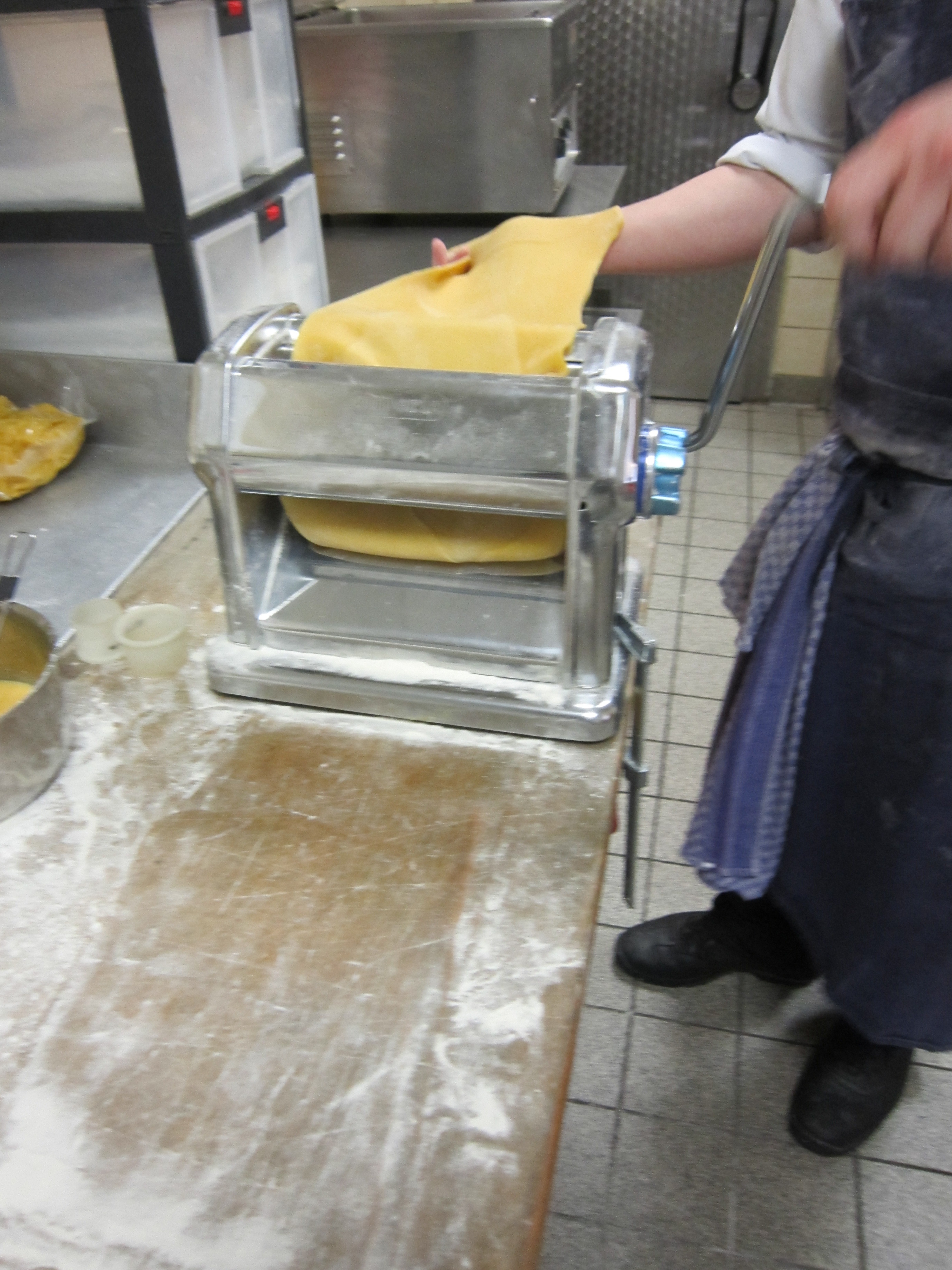 Den Teig mit der Nudelmaschine mehrmals ausrollen, bis die gewünschte Dicke erreicht ist, dabei immer wieder leicht mit Mehl bestäuben.