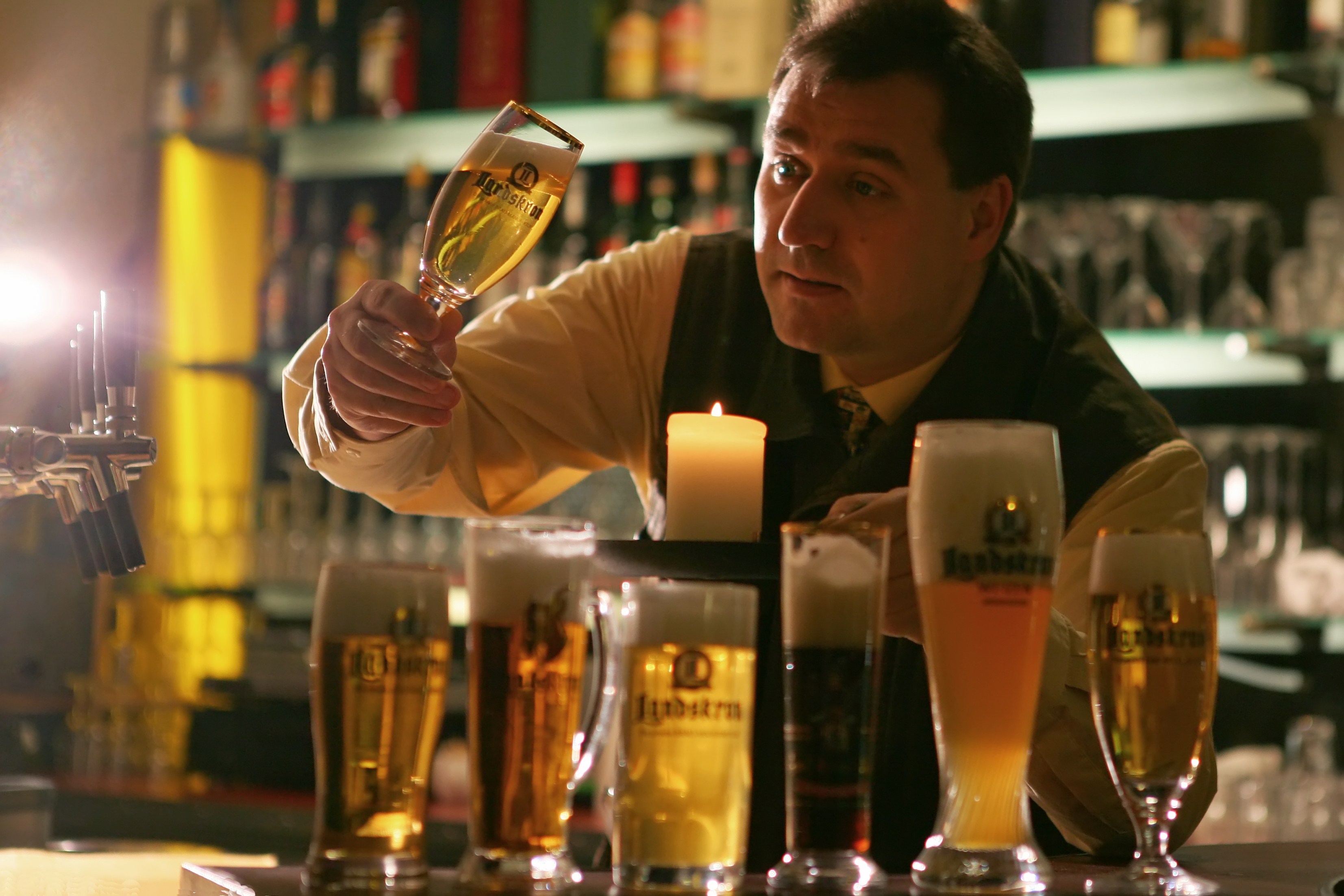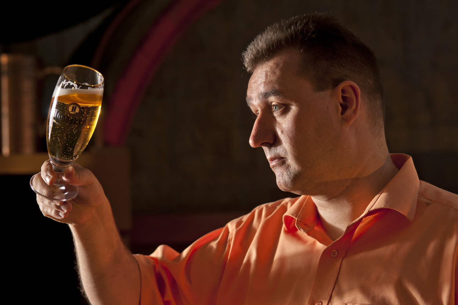 Ein schöner Moment aus dem Alltag der Brau-Manufaktur: Braumeister Matthias Grall prüft die Qualität der Landskron Bierspezialitäten.