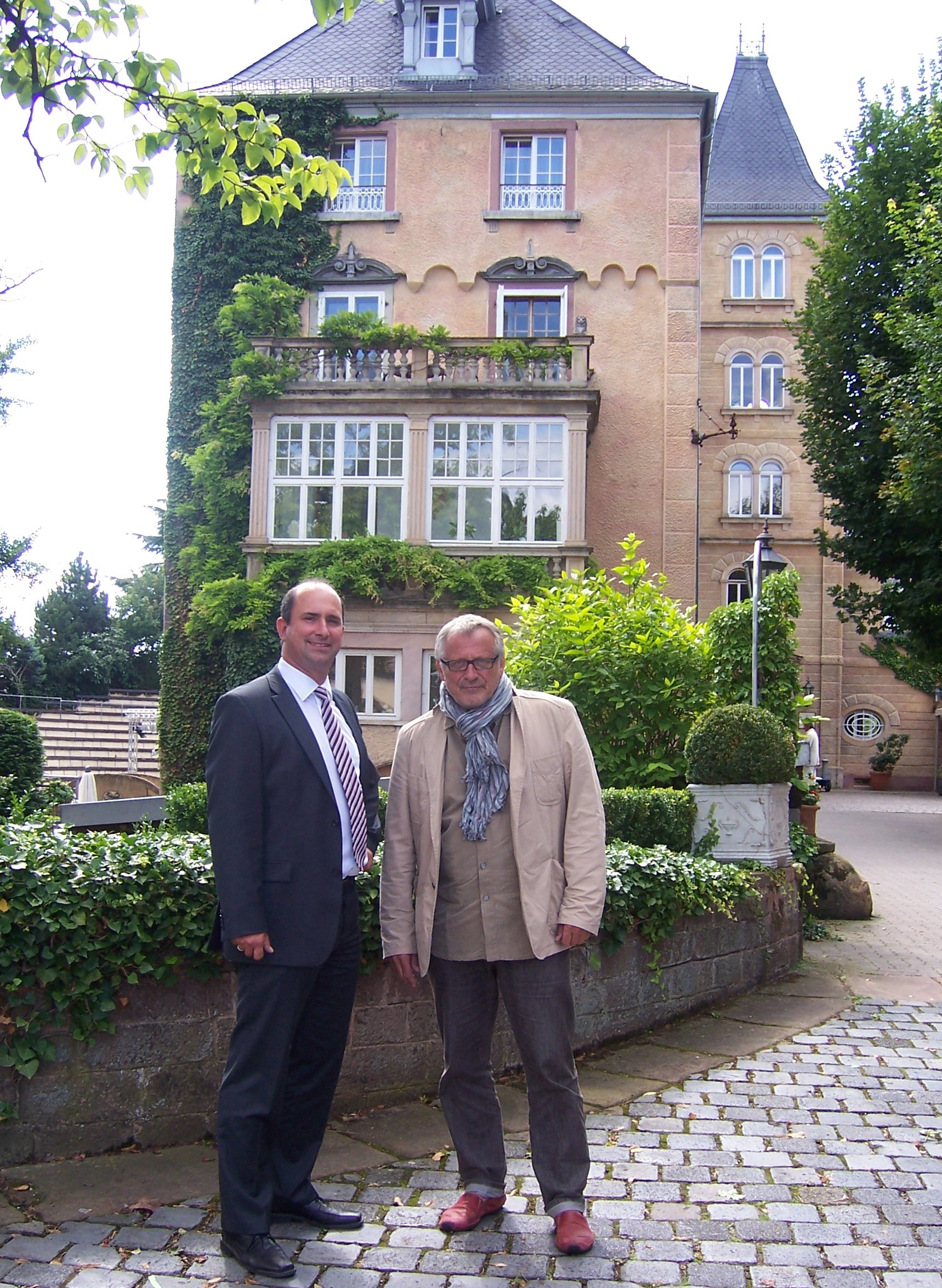 Direktor Sebastian J. Ott (rechts) freut sich über die Auszeichnung „Bestes getestetes Hotel 2010“ für das Landhaus „Zu den Rothen Forellen“ durch Unternehmensberater Ralf Müller (links).