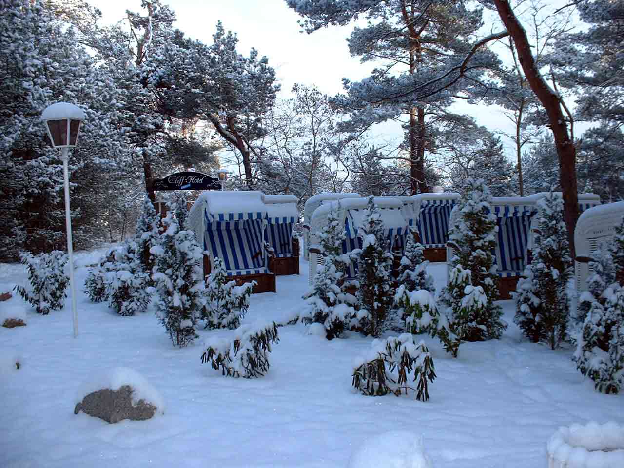 Tief verschneit zeigen sich die Strandkörbe im Winter auf Rügen. Foto: Cliff Hotel Rügen