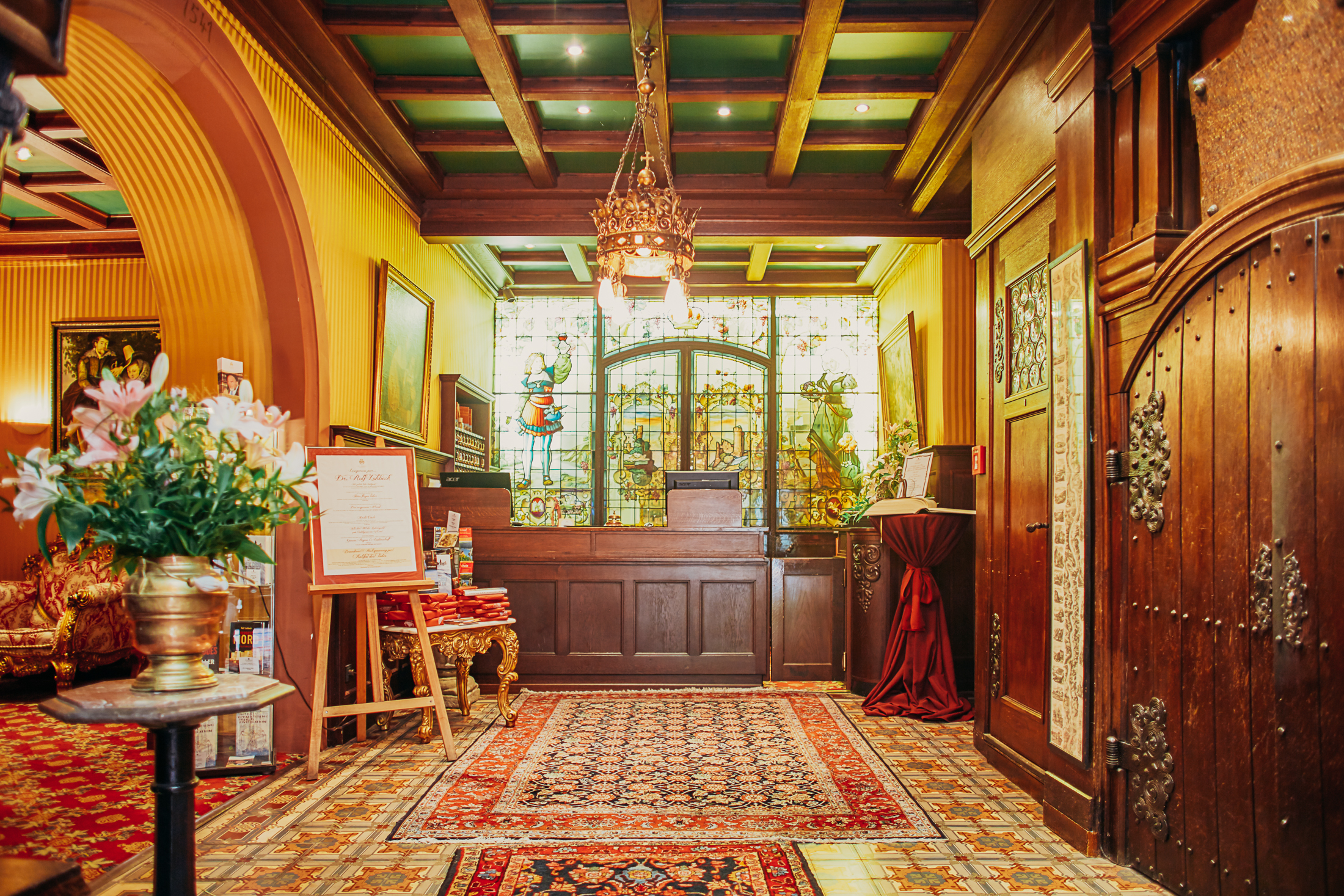 Hotel Krone Assmannshausen - Rezeption mit historischem Glasfenster