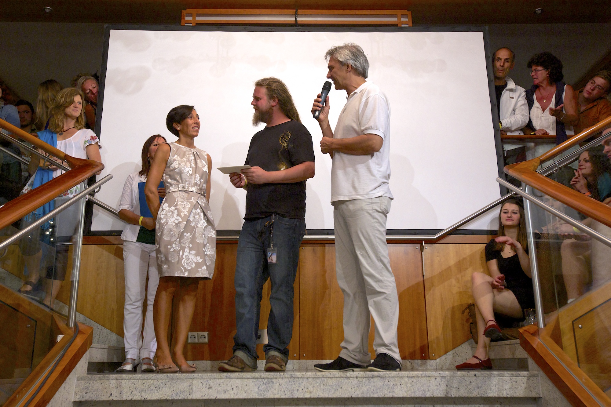Carmela Filannino (links), Sales Managerin des Seehotels Leoni, überreichte am 2. August während einer Dampferfahrt auf dem Starnberger See den Preis für den besten Kurzfilm, ein Wellness-Wochenende im Seehotel Leoni, an den Gewinner Timo Becker (Mitte). Copyright: FSFF / Pavel Broz, Jörg Reuther