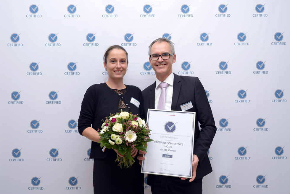 Das Landhaus „Zu den Rothen Forellen“ in Ilsenburg wurde als „Tagungs-Hideaway 2015“ im Rahmen des „Grand Prix der Tagungshotellerie“ der Fachzeitschrift TopHotel ausgezeichnet. Geschäftsführer Sebastian J. Ott (links) erhielt den begehrten Award bei einer Gala in München von Jaqueline Schaffrath, Chefredakteurin Hotelführer der Freizeit-Verlag Landsberg GmbH. Foto: TopHotel / Freizeit-Verlag Landsberg