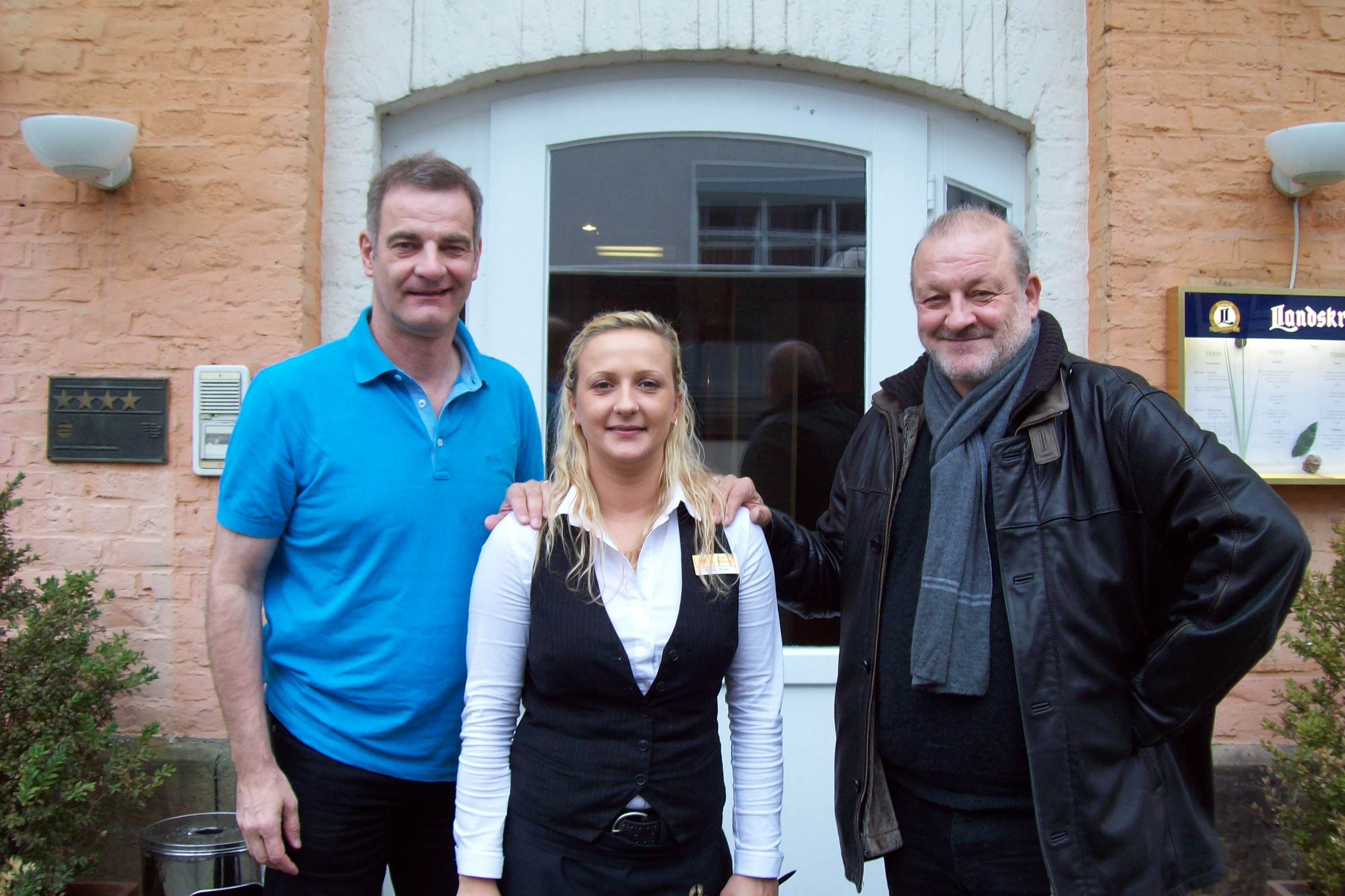 Die Schauspieler Heinrich Schafmeister (links) und Leonard Lansink (rechts) logierten Anfang November einige Tage im Hotel Am Mühlenteich in Schwelm. Zwischen den Theaterproben war noch Zeit für ein Erinnerungsfoto mit Hotelfachfrau-Azubi Aldina Ahmic
