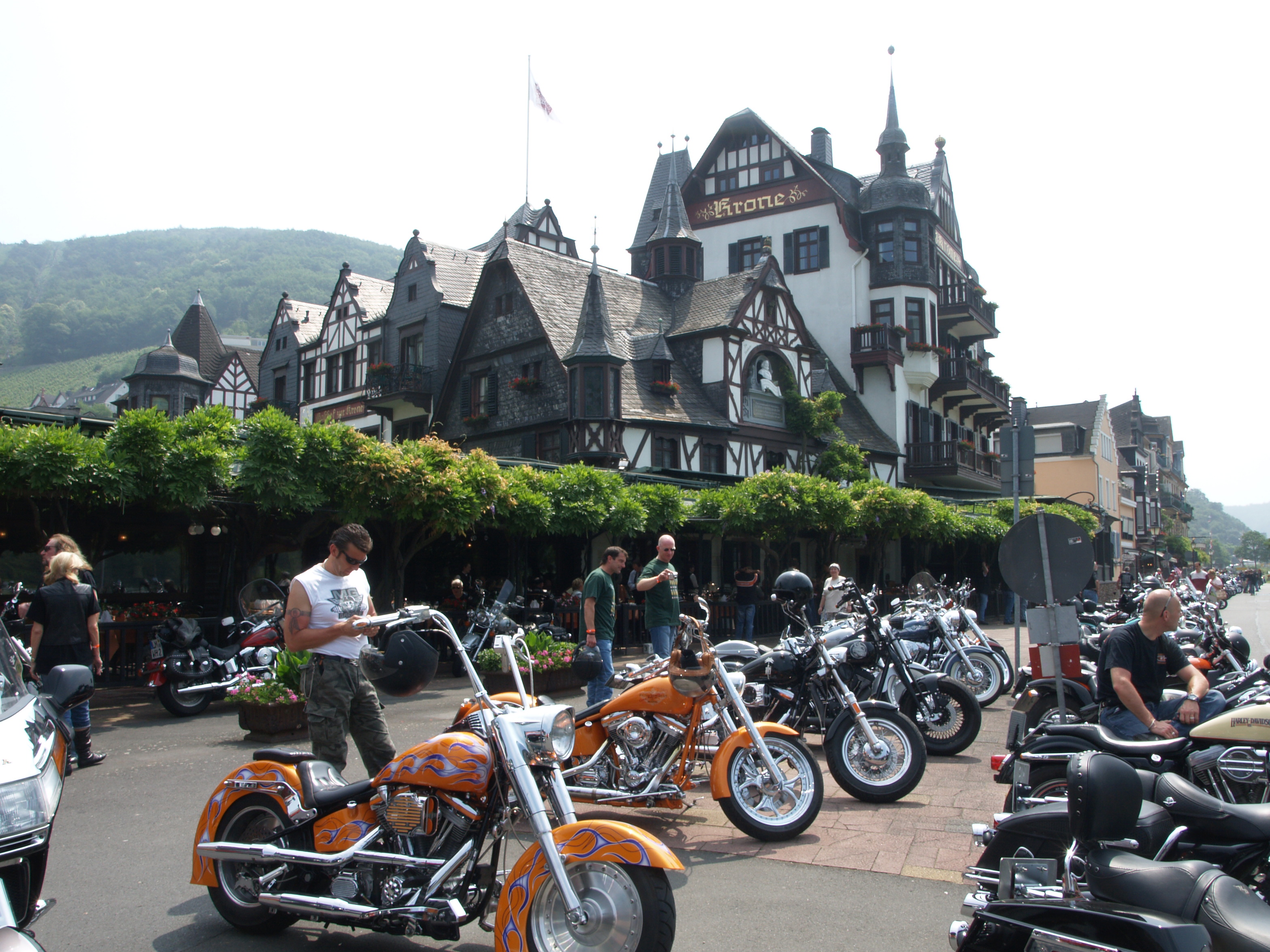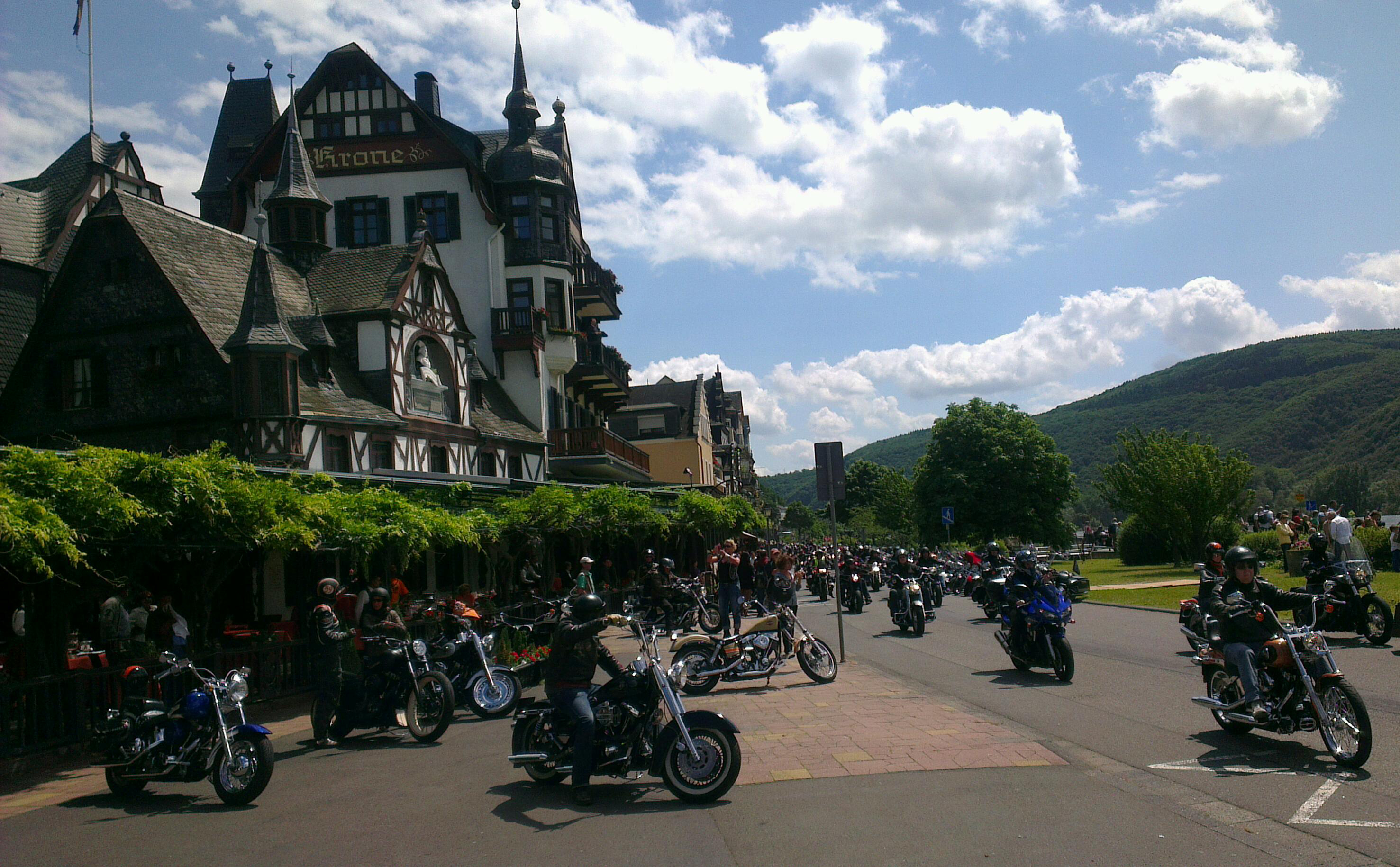 Vor dem Hotel Krone in Assmannshausen präsentieren Biker ihre auf Hochglanz polierten Oldtimer und die neuesten Modelle. Foto: Magic Bike Rüdesheim