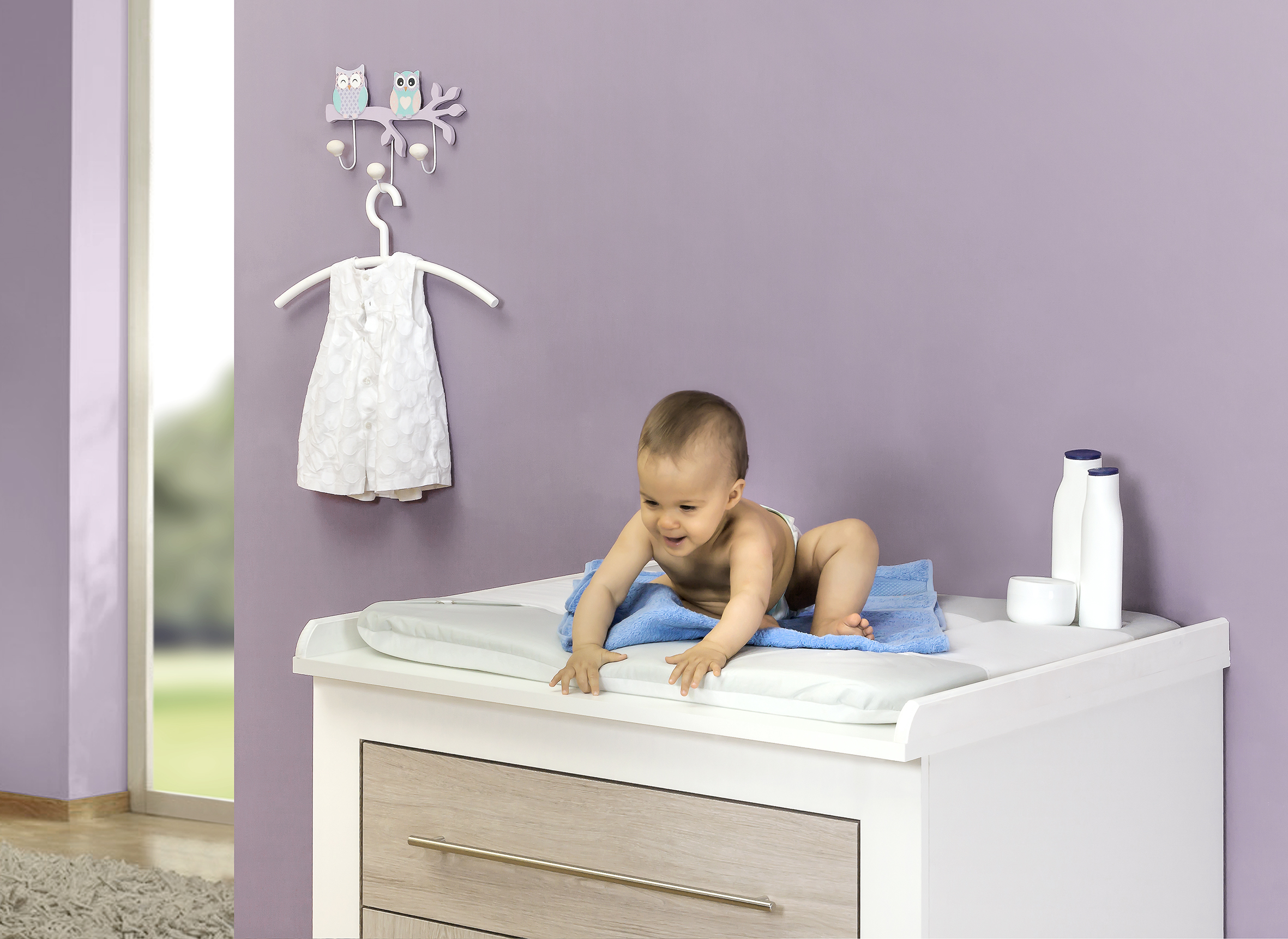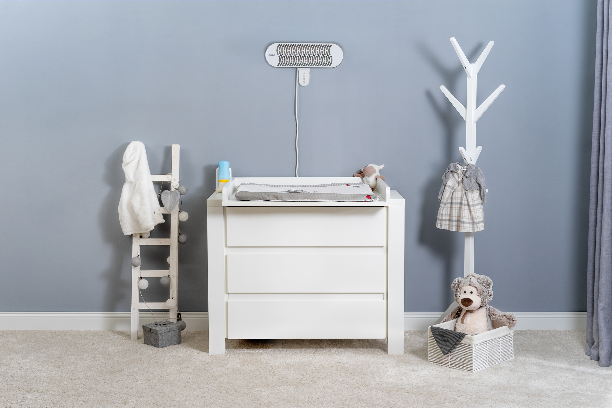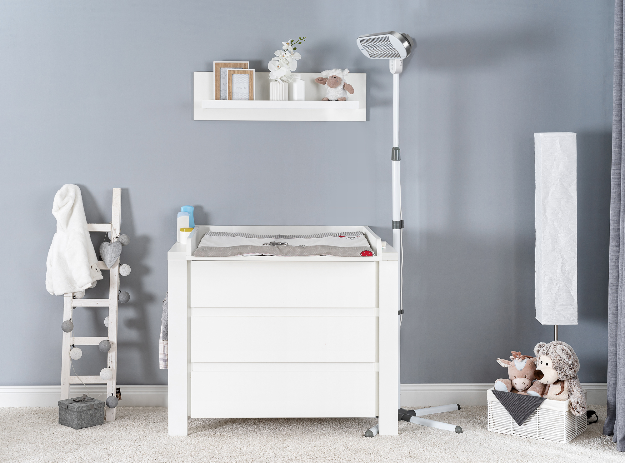 Ein Vater wickelt sein Kind in warmer Atmosphäre - dank dem neuen HeatCare+ Flex Wickeltisch-Wärmestrahler.