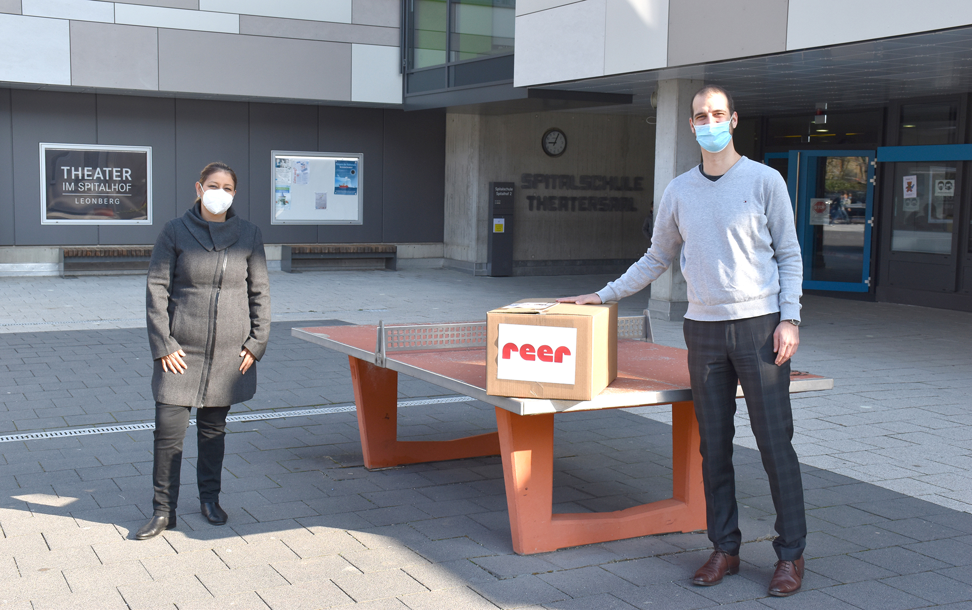 Tobias Mörk, reer GmbH, überreichte am Mittwochmorgen ein großes Paket mit 600 Mundschutzmasken an Frau Khalegi, Vorstand des Fördervereins der Spitalschule.
