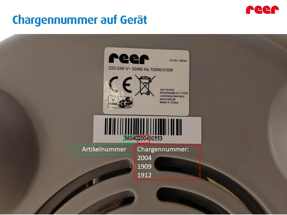 Wie finden Sie heraus, ob Ihr Gerät betroffen ist? Ermitteln Sie hierzu bitte auf der Unterseite des Gerätes die Chargennummer. Folgende Chargennummern sind vom Rückruf betroffen: 2004 , 1909 , 1912