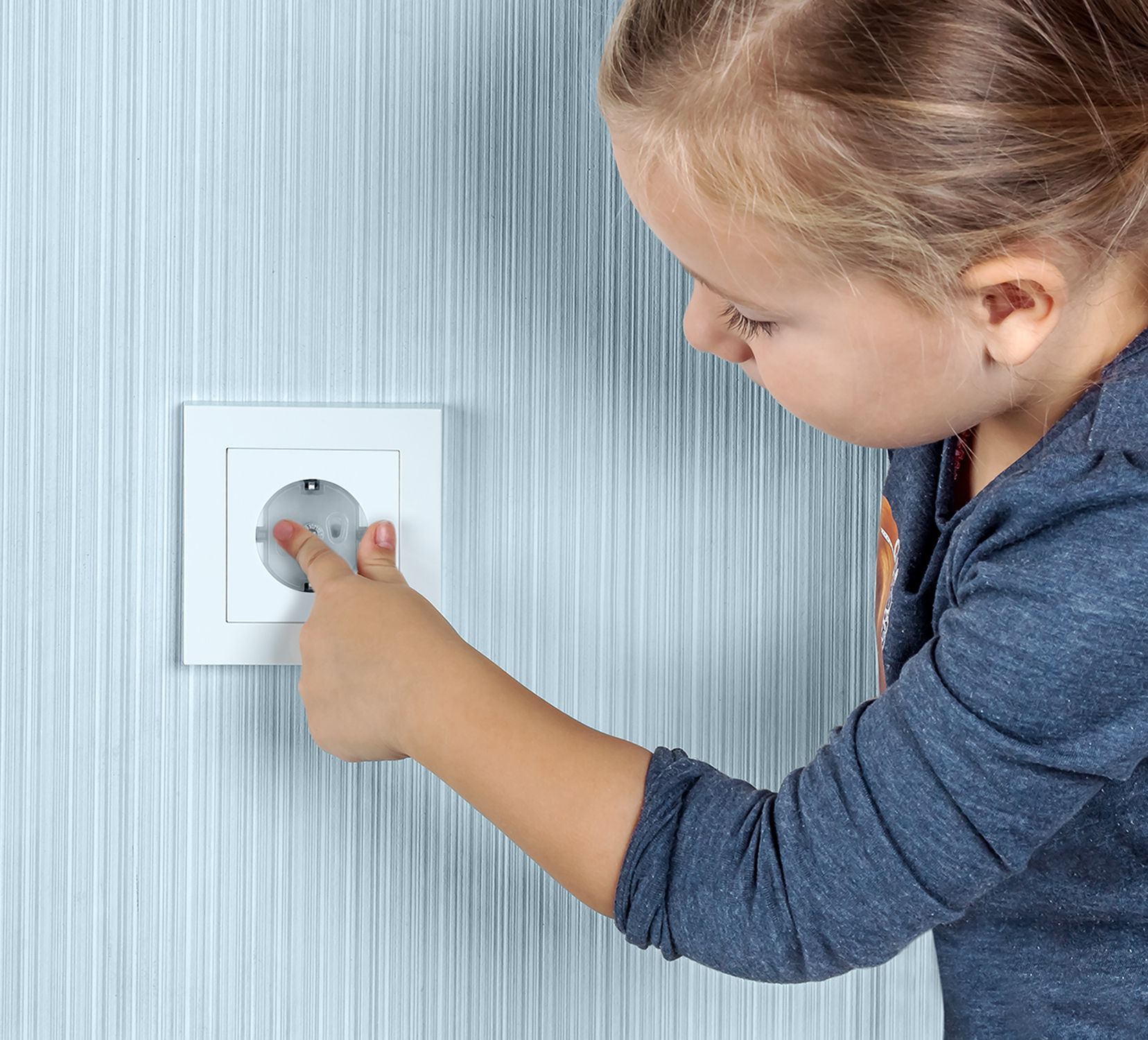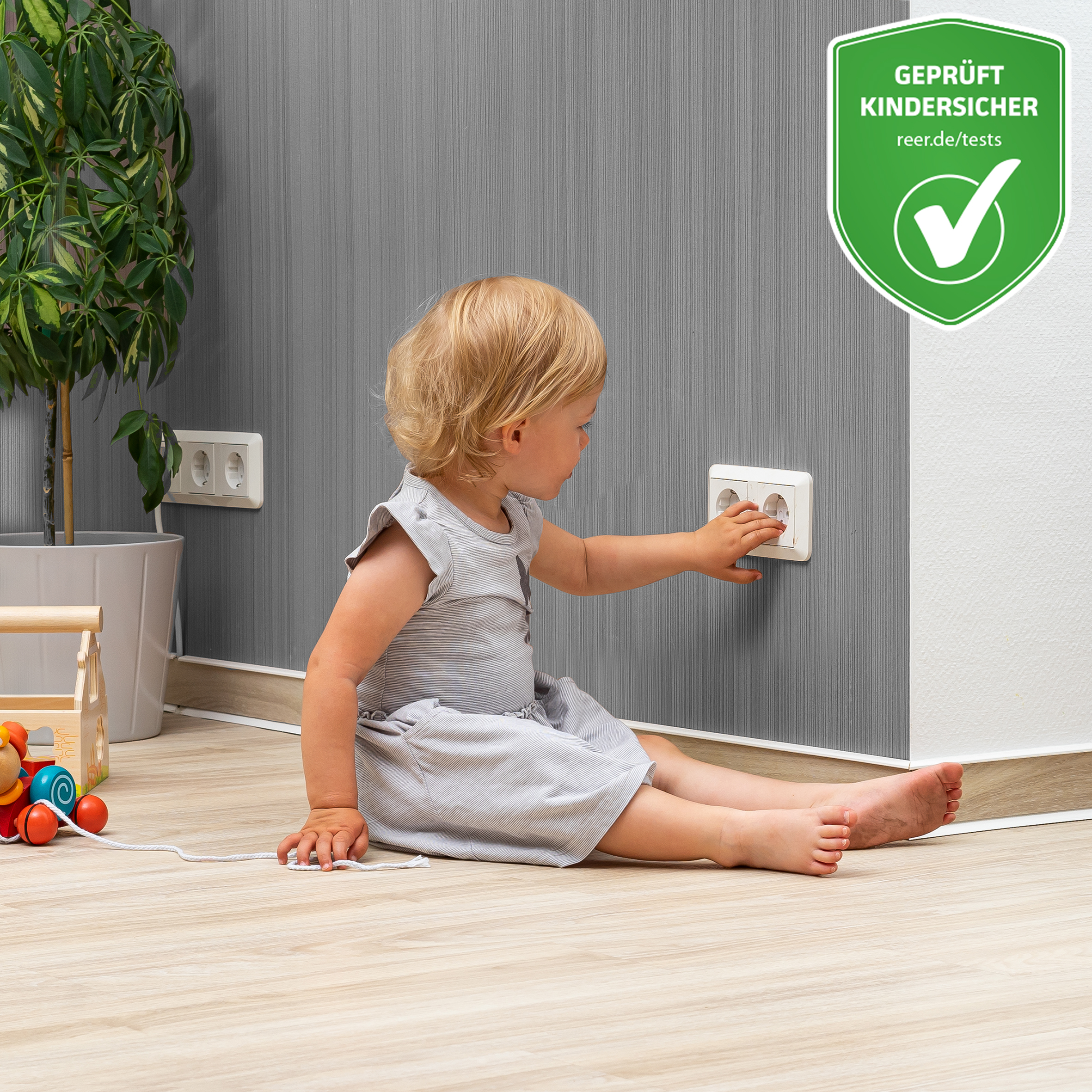 Der nachträglich eingebaute Steckdosenschutz von reer ist die kindersichere, günstige und gefahrlose Alternative zu Steckdosen mit erhöhtem integrierten Berührungsschutz.