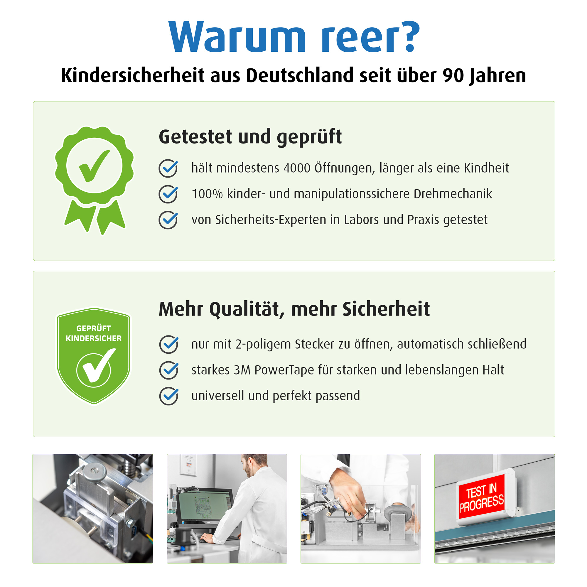 Der nachträglich eingebaute Steckdosenschutz von reer ist die kindersichere, günstige und gefahrlose Alternative zu Steckdosen mit erhöhtem integrierten Berührungsschutz. Endverbraucher müssen jedoch beim Kauf zwingend auf die Qualität des Steckdosenschutzes achten und dürfen nicht einfach davon ausgehen, dass jeder Hersteller so hohe Qualitäts- und Prüfanforderungen an seine Produkte stellt.