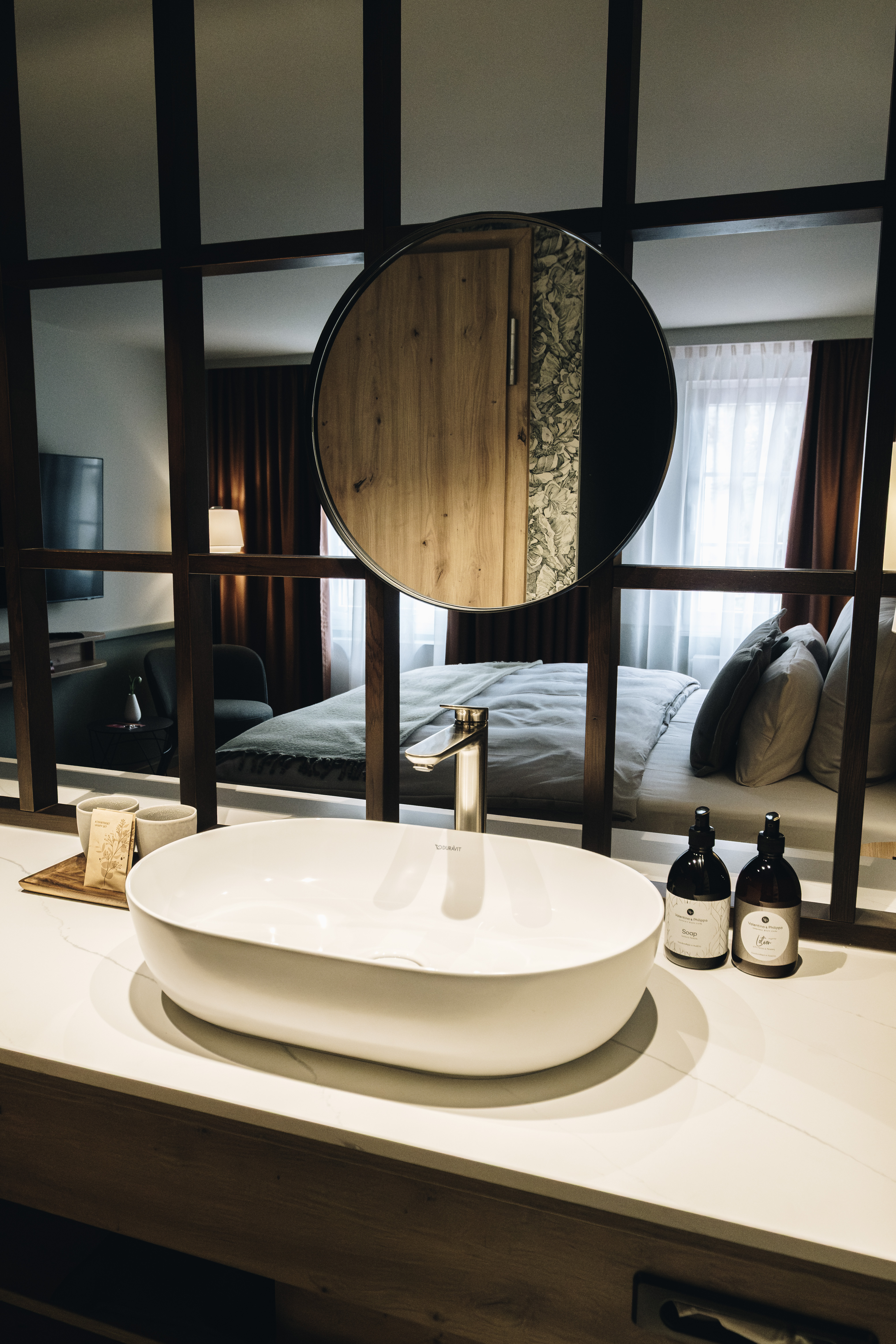 Die Hotelinhaber, Simon Bruker und Elena Schnaas-Bruker, hatten mit dem ersten Preis des Wettbewerbs die maßgeschneiderte Planung, Konzeption und Ausstattung eines Hotelzimmers inklusive Bad gewonnen, die von den Projektpartnern ROLF BENZ, Duravit, Fritz Schlecht| SHL Hoteleinrichtungen sowie weiteren Unternehmen aus der Region umgesetzt wurde. Seit Ostern 2025 kann das Zimmer gebucht werden und Simon Bruker zieht ein begeistertes Fazit: „Die Stammgäste des Hotels haben sehr positiv auf das neue Zimmer reagiert – und darüber hinaus hat es auch schon neue Gäste angezogen, die unser Haus bisher noch nicht kannten. Was uns zudem besonders freut sind die Rückmeldungen, dass das neue Zimmer mit den stimmigen Farben und Materialien ein zu unserem Haus passendes Schwarzwaldgefühl transportiert. Genau das wollten wir in der Zusammenarbeit mit allen Projektpartnern erreichen.“ Für die Authentizität des Konzepts spreche, dass man auch in dem modernen Zimmer spüre, Gast in einem mehr als 300 Jahre alten Haus zu sein, so Bruker. „Wir wollen die Seele dieses Hauses bewahren.“ Das Leuchtturmprojekt soll zudem der rote Faden für künftige Zimmerrenovierungen sein, die stets Tradition und Moderne miteinander verbinden. „Wir wollen neben unseren bisherigen Stammgästen eine neue Zielgruppe erreichen und auch diese zu gern wiederkehrenden Gäste machen.“