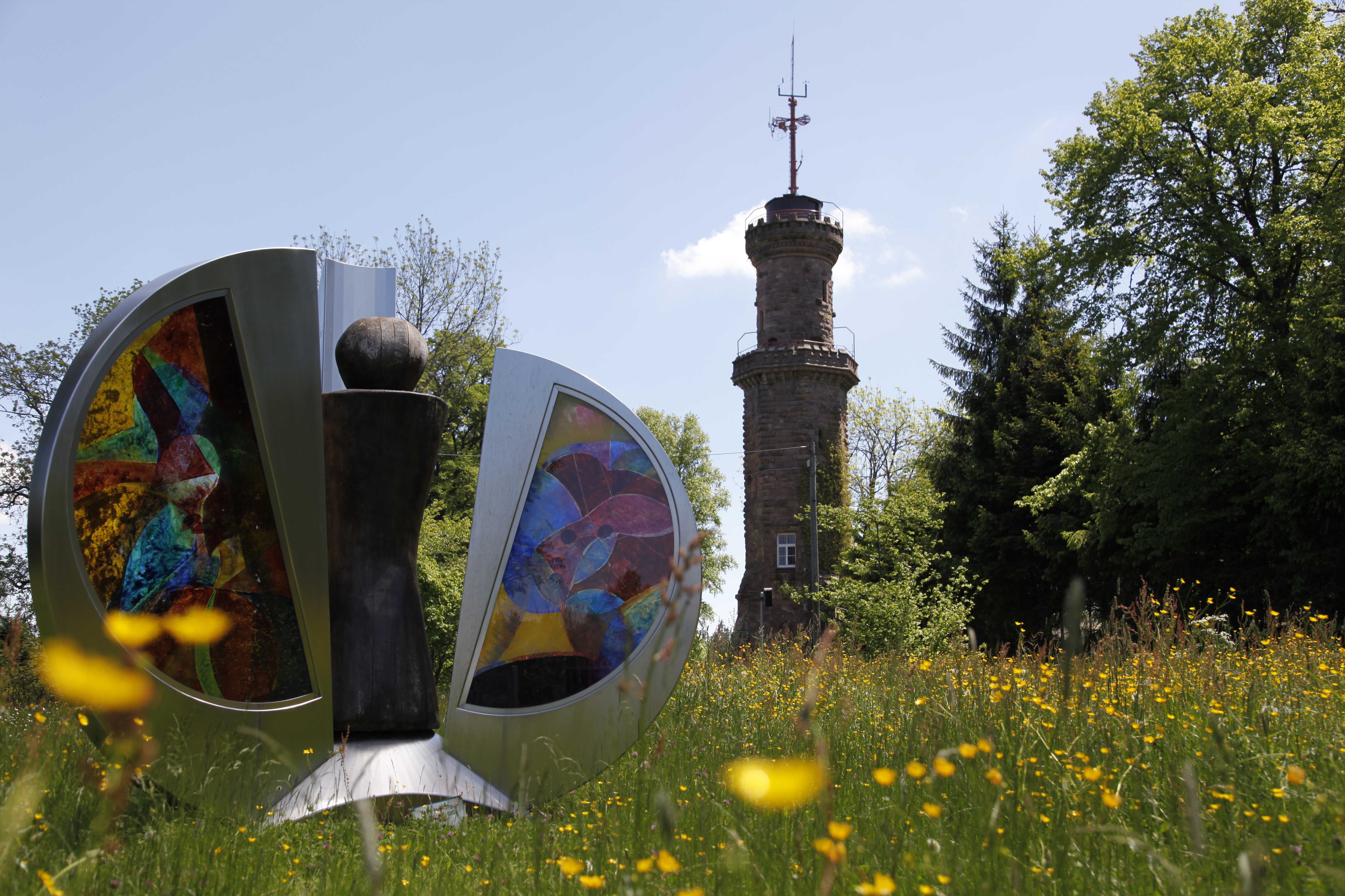 Geschichtsträchtige und moderne Kunstwerke vereint der Skulpturenweg in Freudenstadt: Er führt auf fünf Kilometern auf den Kienberg hinauf. Oben erwartet Wanderer der Duft tausender Wildrosen und ein Panoramablick vom Friedrichsturm über den nördlichen Schwarzwald. Auf der Rundtour sind mehr als 40 Skulpturen und gestaltete Brunnen von Künstlern wie Wolf Bröll oder René Dantes zu sehen. Vor dem Friedrichsturm steht Margot Jolanthe Hembergers „Entfaltung“ (Foto): Die übergroße Blüte aus Edelstahl, bemaltem Glas und Holz illustriert die These der 2016 gestorbenen Loßburger Bildhauerin, dass es keine Form und keine Struktur gibt, die nicht in der Natur vorgegeben wäre. www.freudenstadt.de/skulpturenpfad