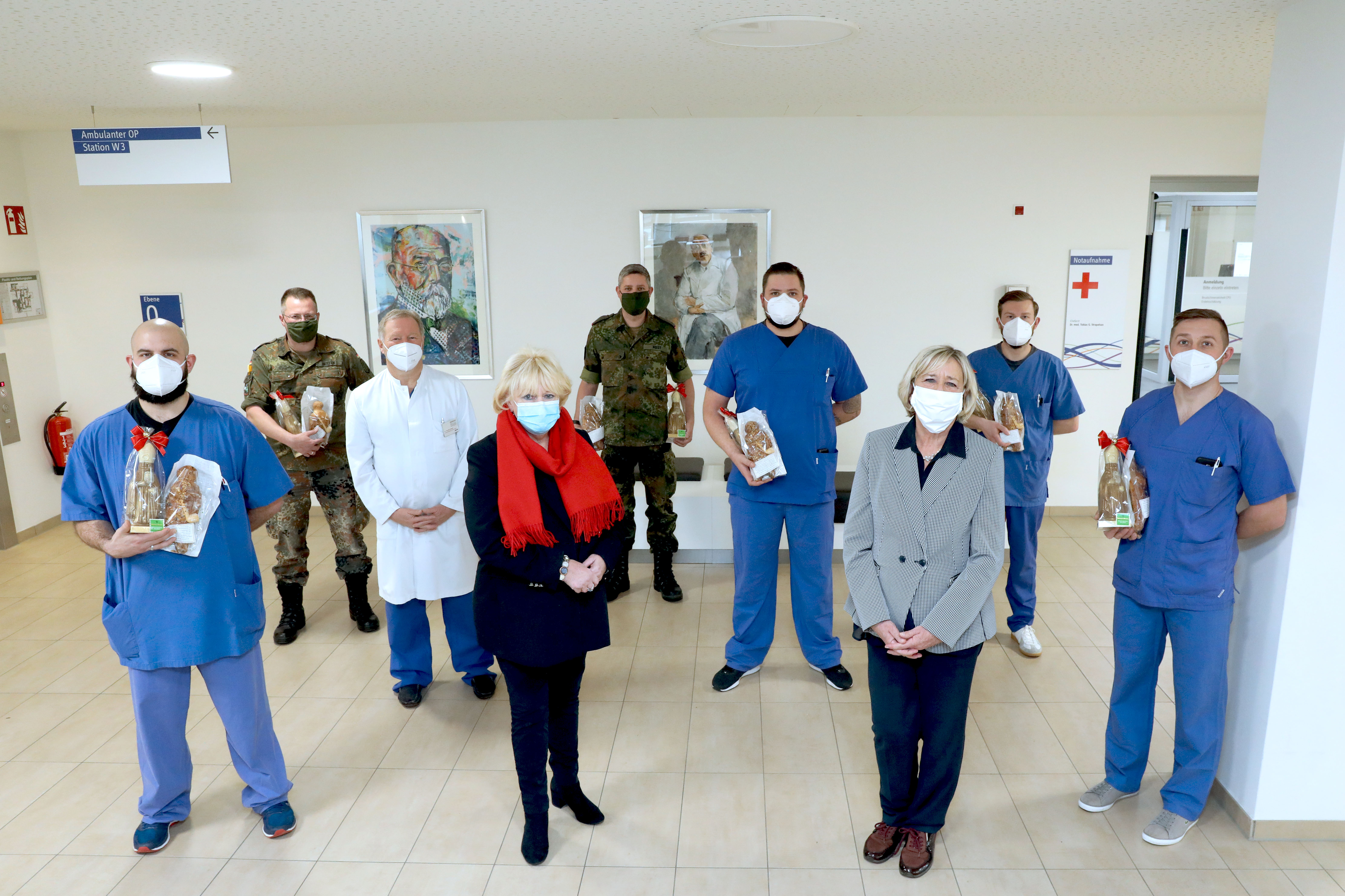 (lifepr) (Mönchengladbach, 07.12.2020) Kurz vor Dienstschluss gab es für die vier Soldaten eine Überraschung, die so wohl in keiner Dienstanweisung steht. Monika Berten, die scheidende Aufsichtsratsvorsitzende der Städtischen Kliniken, war mit ihrer Kollegin Manuela Luhnen, die ebenfalls nicht mehr dem neuen Aufsichtsrat angehören wird, gekommen, um die Truppenstärke mit Schokoweihnachtsmännern zu erweitern: „Wir möchten uns heute im Namen der Patientinnen und Patienten, aber auch im Namen aller Bürgerinnen und Bürger für Ihre schnelle und professionelle Hilfe bei der Unterstützung der Zentralen Notaufnahme bedanken.“