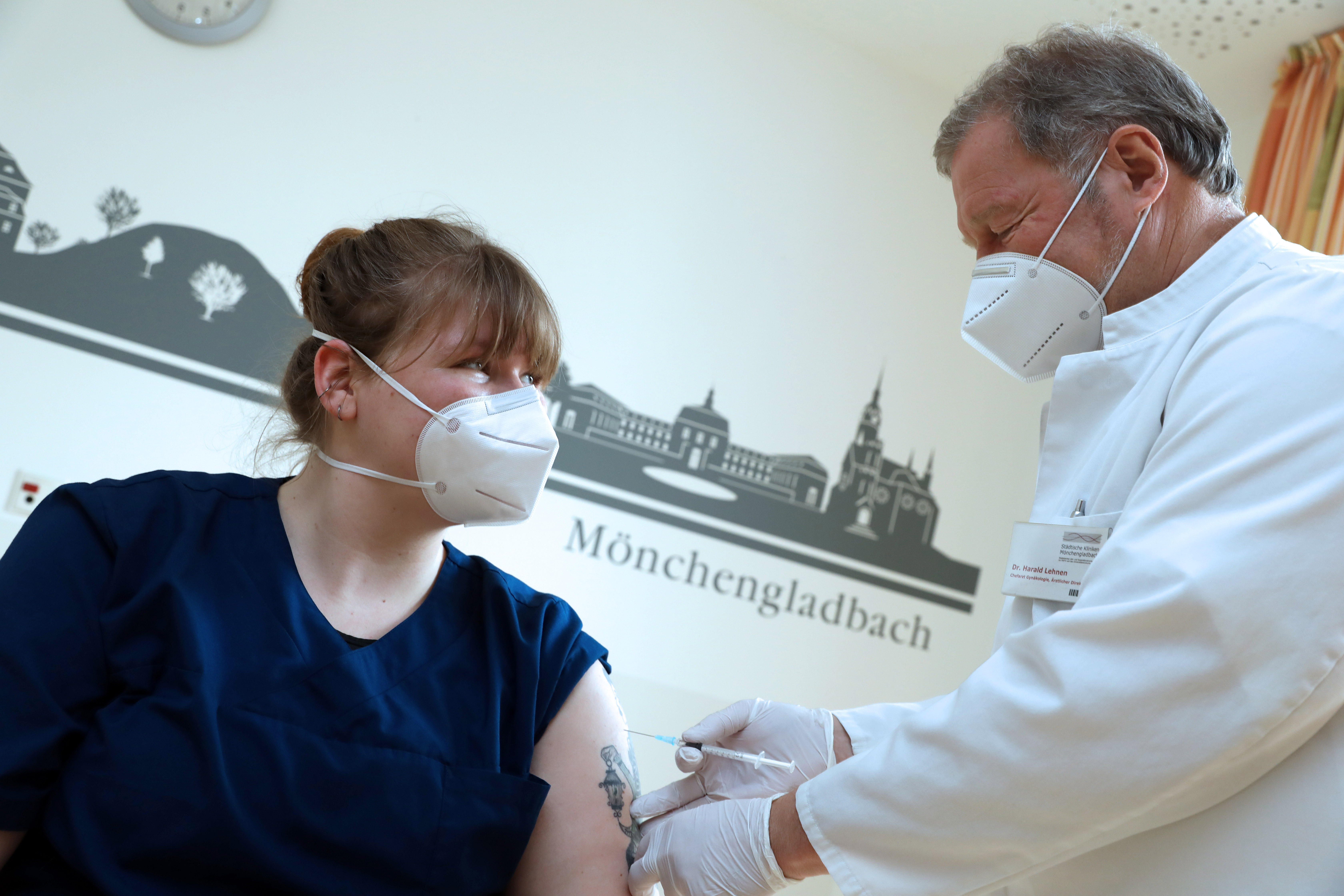 Der Ärztliche Direktor Dr. Harald Lehnen lässt es sich an diesem Vormittag nicht nehmen die Injektion zu setzen. Er fragt kurz, ob Schwester Annika Rechts- oder Linkshänderin ist und sticht dann die Nadel in ihren linken Oberarm. Wie simpel, meint er: „Nur die Kappe der Spritze abnehmen und dann ein kleiner Pieks, fertig.“