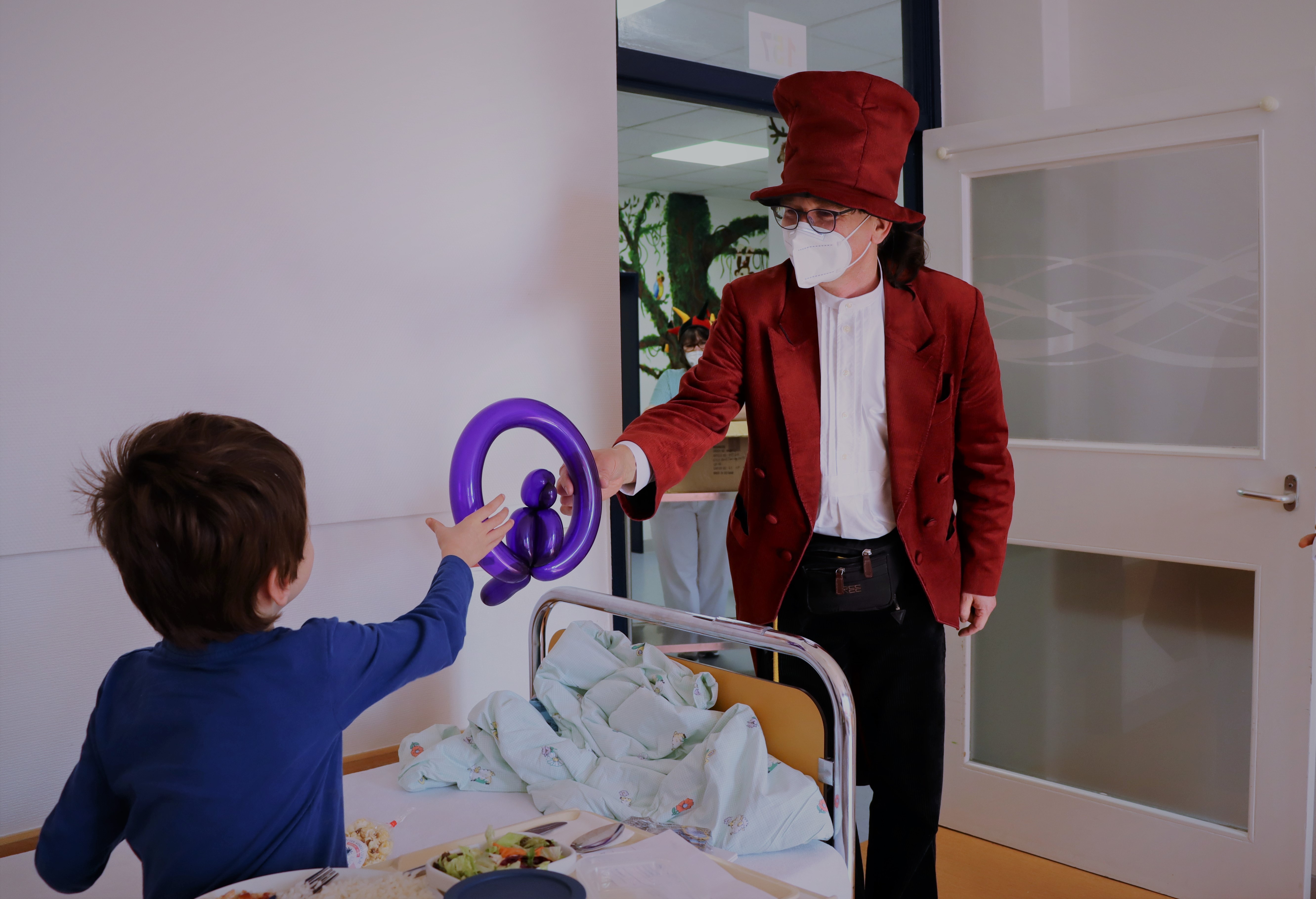 Umso mehr freuten sich alle, dass Bernhard Hansen auf den „Notruf" der Chefärztin reagierte und der Besuch des Zauberers an Karneval erstmals wieder möglich wurde. Mit Musik, Ballons, Zauberei und ordentlich Kamelle zogen der Zauberer und Erzieherinnen am Veilchendienstag unter Einhaltung aller Hygienerichtlinien durch die Krankenzimmer und hinterließen viele glückliche kleine und große Gesichter.