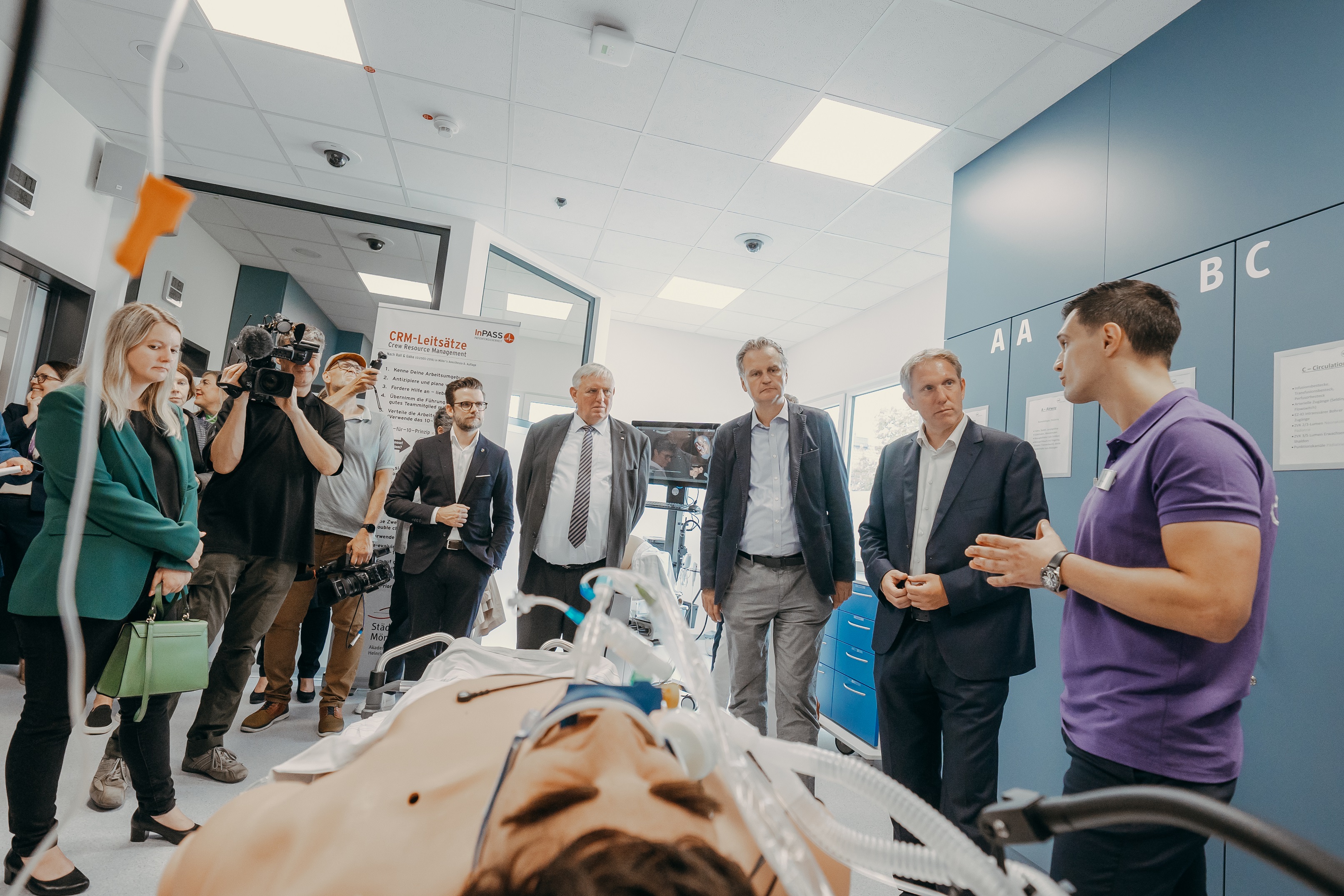 Was das SAM als einziges solcher Zentren in NRW ab sofort bietet, darüber informierte sich die Gruppe gemeinsam mit Vertretern des Gesundheitsministeriums, der Politik, darunter Dr. Günter Krings, des Universitätsklinikums Düsseldorf und mit Kooperationspartnern des SAM zuvor bei einer Führung durch das Simulationszentrum: SAM ist auf multidisziplinäre Notfalltrainings spezialisiert und hält Übungsformate bereit, die mittels modernster Technik einen realitätsnahen Praxisbezug abbilden. Simuliert werden vordefinierte medizinische Situationen wie zum Beispiel Geburtskomplikationen, die Notfallversorgung eines Kindes oder eines verunfallten Patienten.