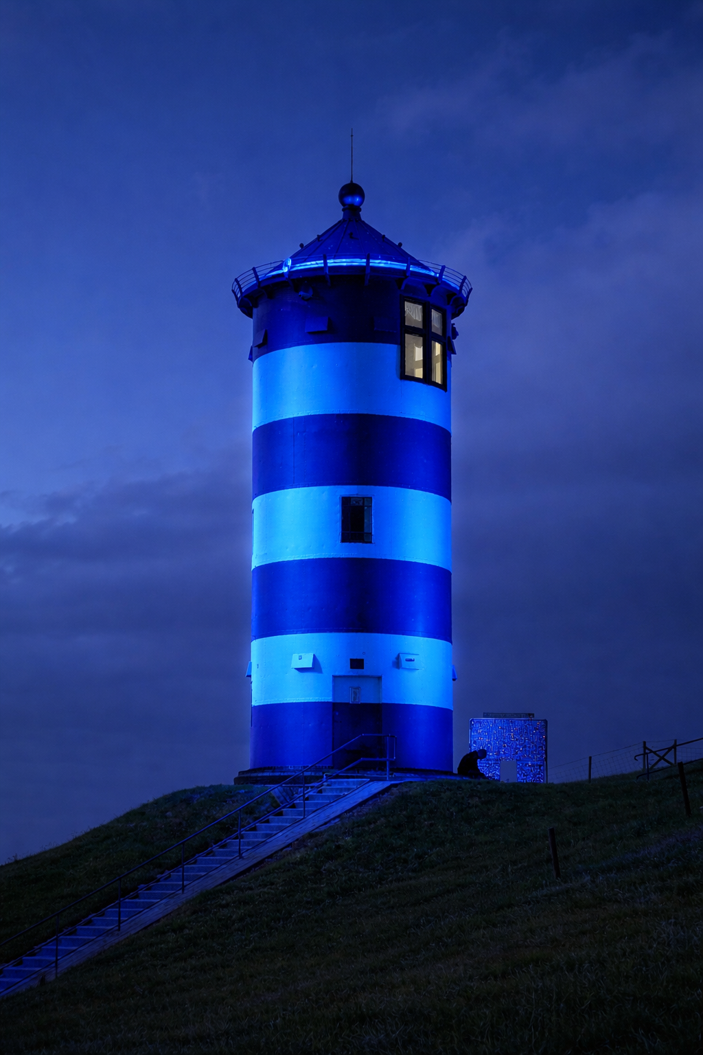 Illuminierter Pilsumer Leuchtturm und Fotokontrolleur
