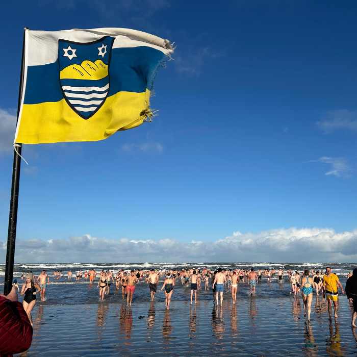 Trotz winterlich-stürmischer Bedingungen stürzte sich eine Rekordzahl an Teilnehmern beim traditionellen Neujahrsschwimmen 2026 auf Juist mutig in die Nordsee. Begleitet von Bürgermeister Dr. Tjark Goerges klang der eiskalte Jahresauftakt anschließend bei Glühwein und alkoholfreiem Punsch am Meerwasser-Erlebnisbad aus