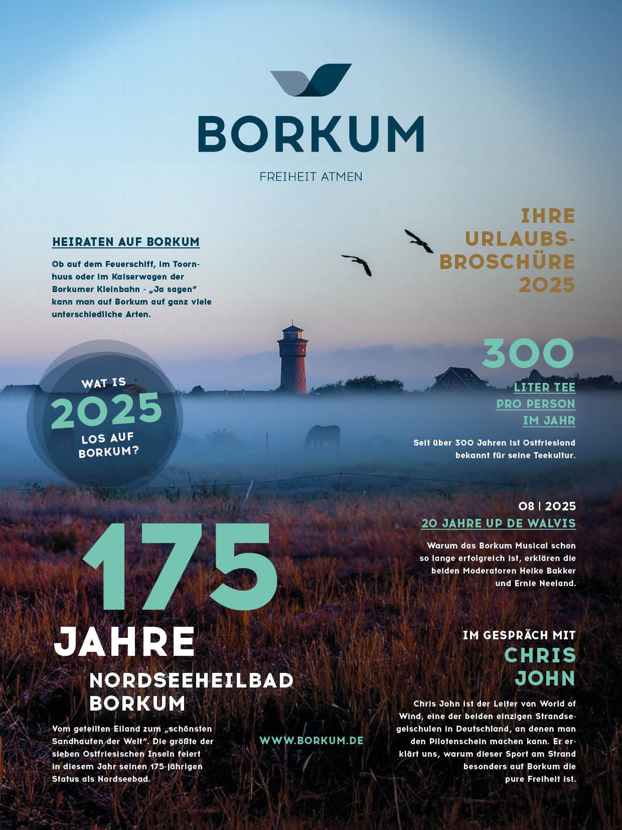 Außerdem: Wie ist das Leben auf Borkum? Sieben Borkumer Bürger aus den verschiedensten Bereichen haben über ihr privates und berufliches Glück auf der Insel gesprochen. Die Urlaubsbroschüre 2025 gibt es in der Tourist-Information am Georg-Schütte-Platz und online unter www.borkum.de/broschuren zum Durchlesen, herunterladen oder ganz klassisch zu bestellen. Viel Spaß beim Stöbern!