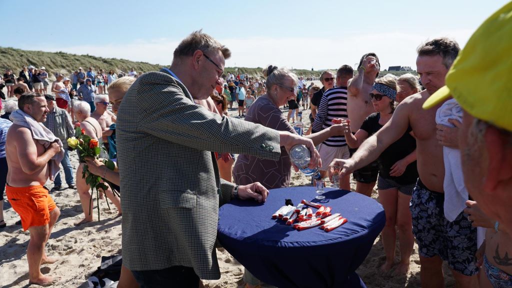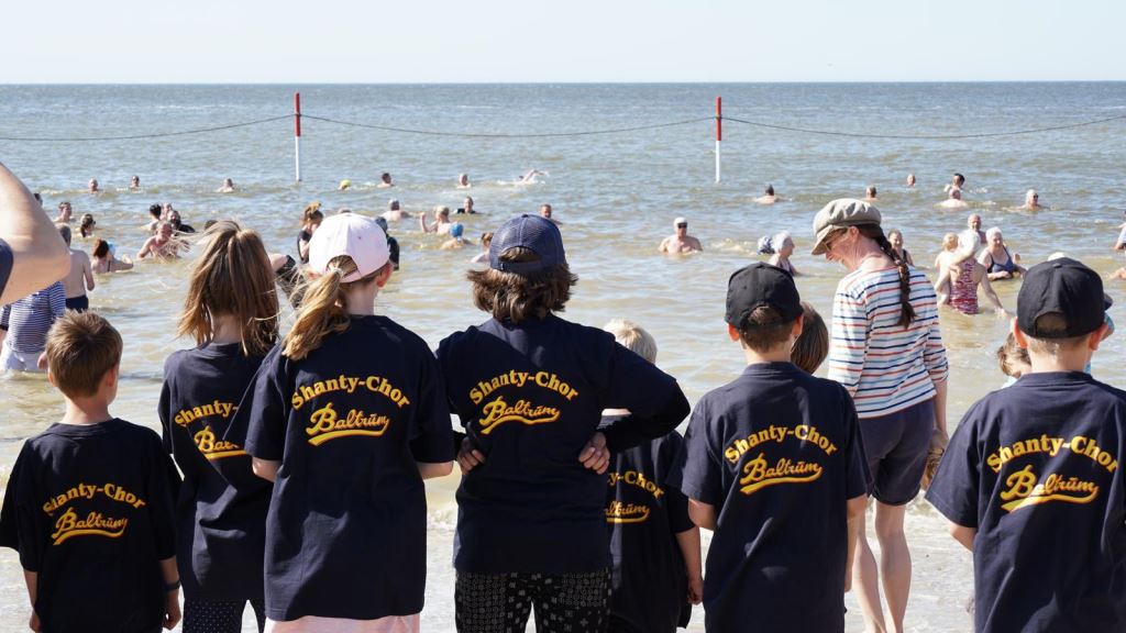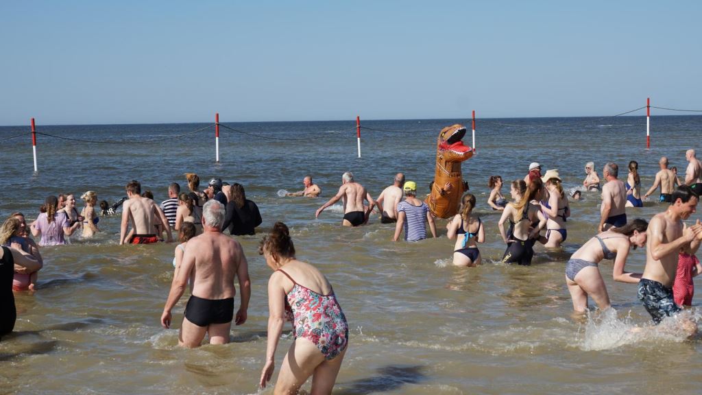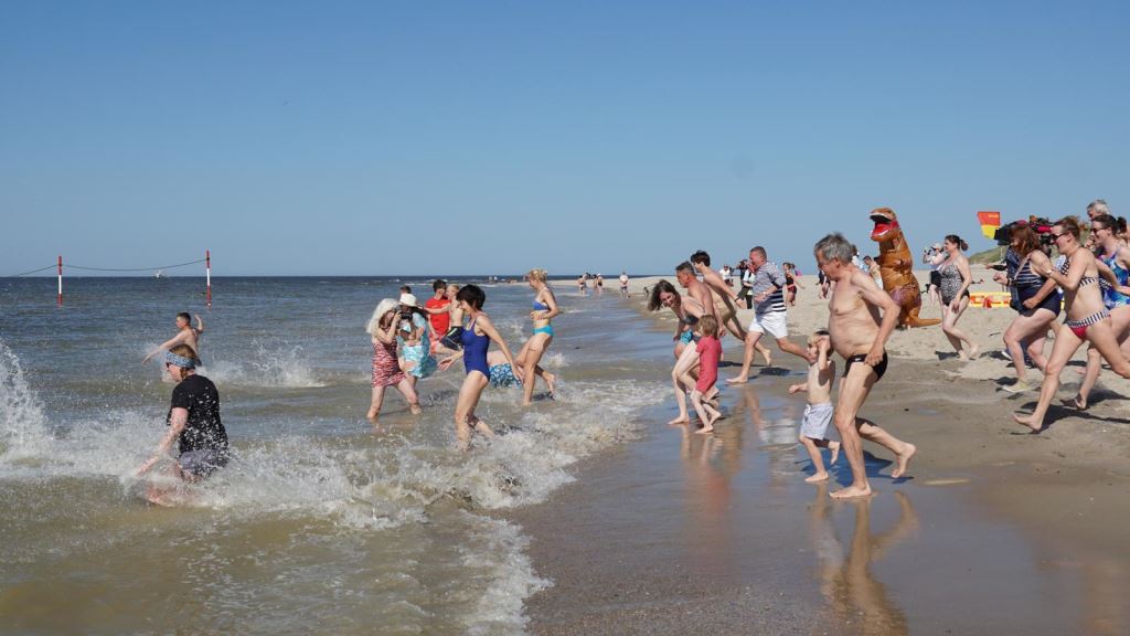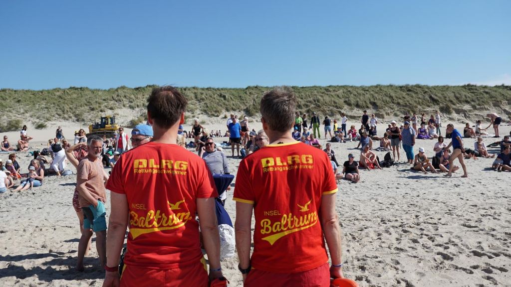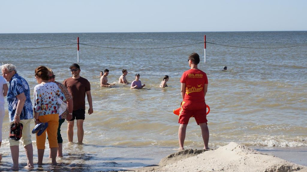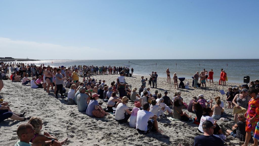 (lifepr) (Wilhelmshaven, 16.05.2024) Etwa 100 Urlaubsgäste und Insulaner wollten sich den feierlichen Sprung ins kühle Nass nicht entgehen lassen. Mehr als fünf Mal so viele waren am Strand „zum Luschern“ mit dabei. Bei tollem Insel-Wetter (strahlender Sonnenschein, etwas Wind um die Nase) gab Bürgermeister Harm Olchers um Punkt 16:30 Uhr die offizielle Badezone frei. Ab sofort wird der Bereich auch von dem am Wochenende eingetroffenen DLRG-Team gesichert.