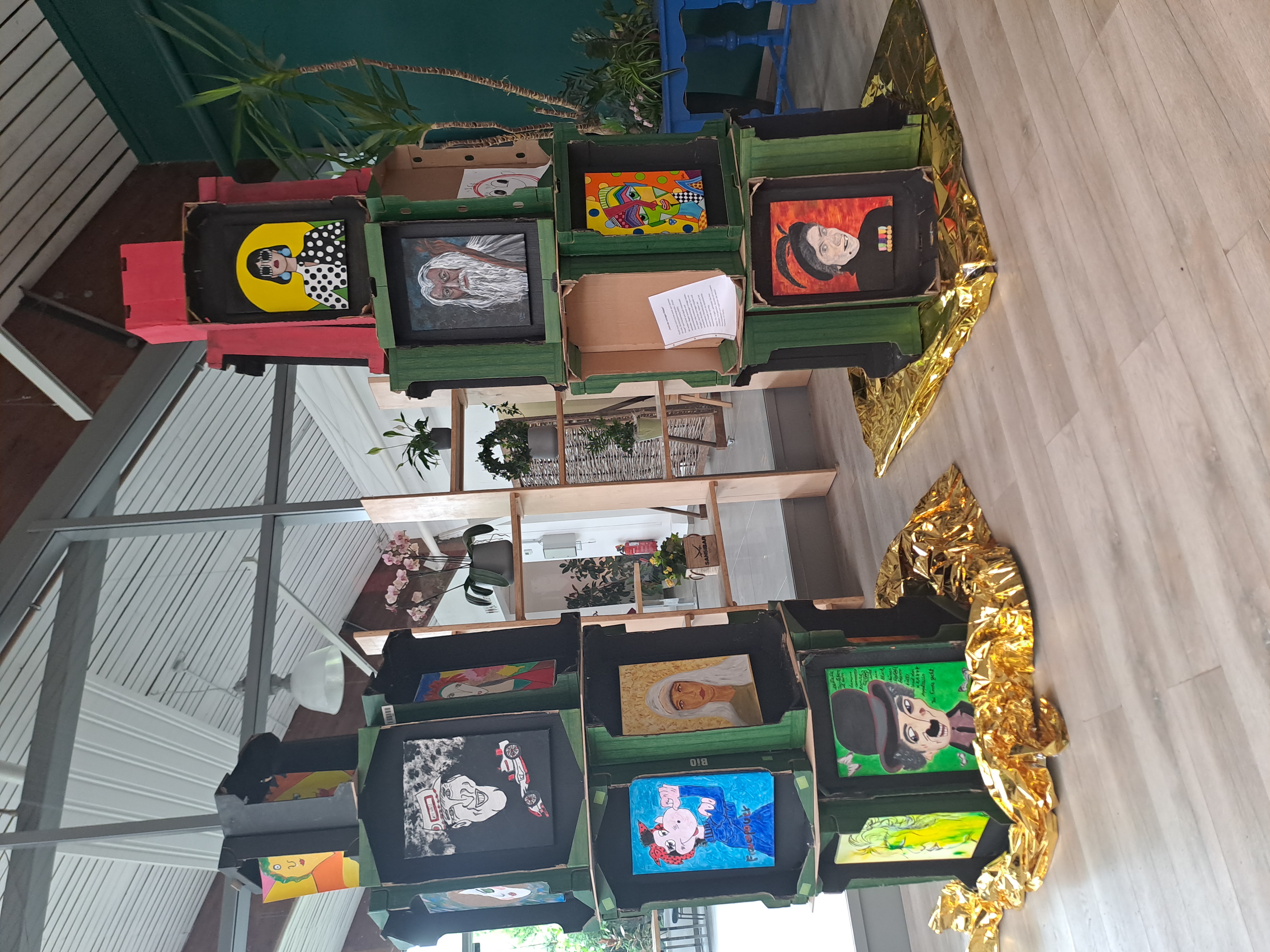 Kunst muss nicht immer ernst sein dachten wir uns, die Künstlergruppe "Flotter Pinsel" aus Freudenberg (NRW). Wir wollen Kunst und Spaß miteinander verbinden, Regeln brechen und Gewohnheitsbetrachtungen infrage stellen. Aus dieser Idee entstand unser Turm mit lustigen skurrilen schrägen Köpfen und karikierten Porträts. Neben der verfremdeten Darstellung war uns bei diesem Projekt auch ein dynamisches Nebeneinander wichtig.