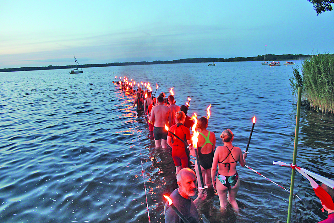 Auch in diesem Jahr wird es wieder das beliebte Fackelschwimmen der DLRG geben. In der Dämmerung – erfahrungsgemäß ab 22 Uhr – steigen rund 100 Schwimmerinnen und Schwimmer mit ihrer brennenden Fackel in das Zwischenahner Meer und präsentieren dabei ihre Choreografie. Anlässlich des 900-Jahr-Jubiläums haben die Fackelschwimmer etwas Besonderes vorbereitet.