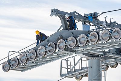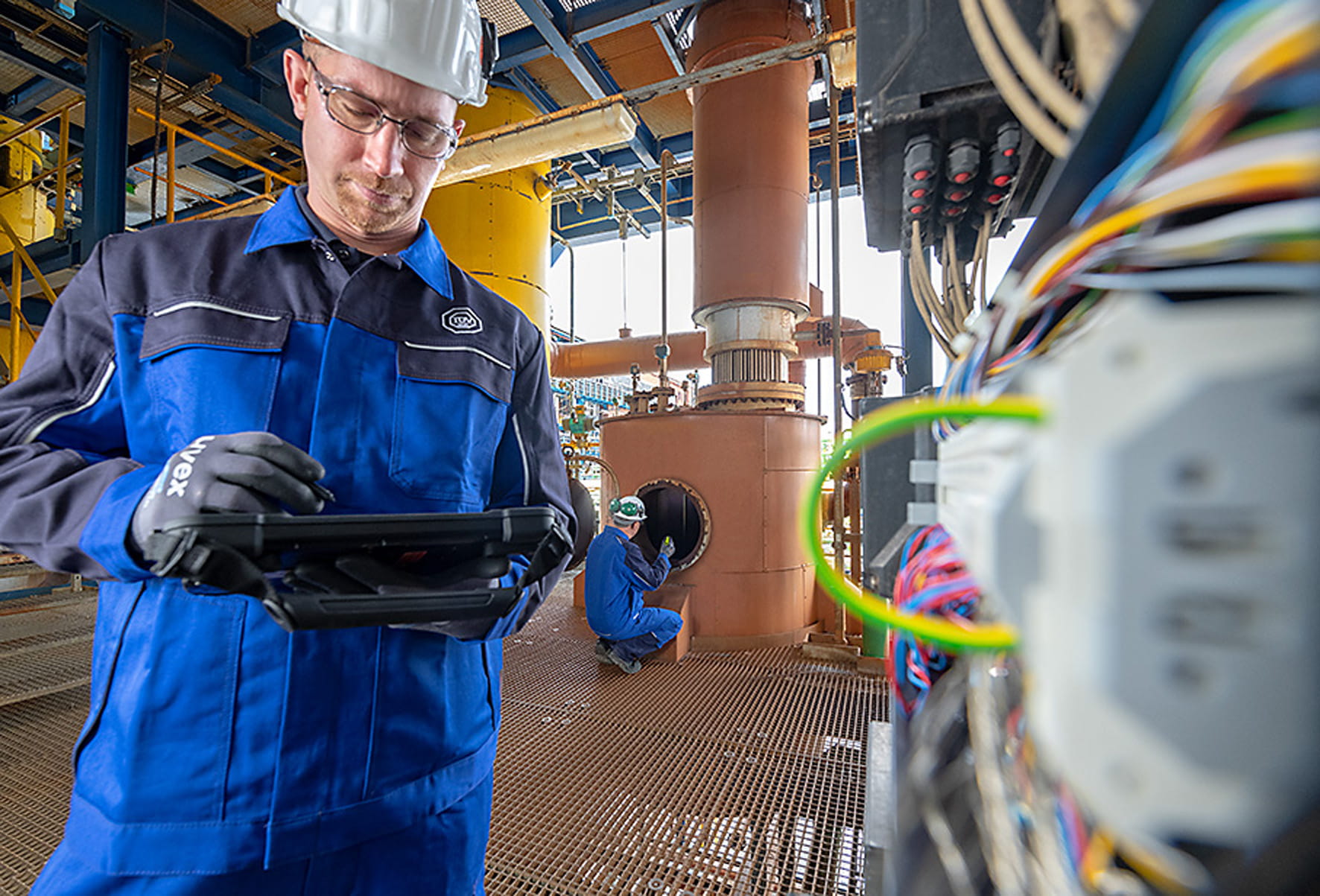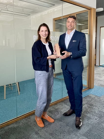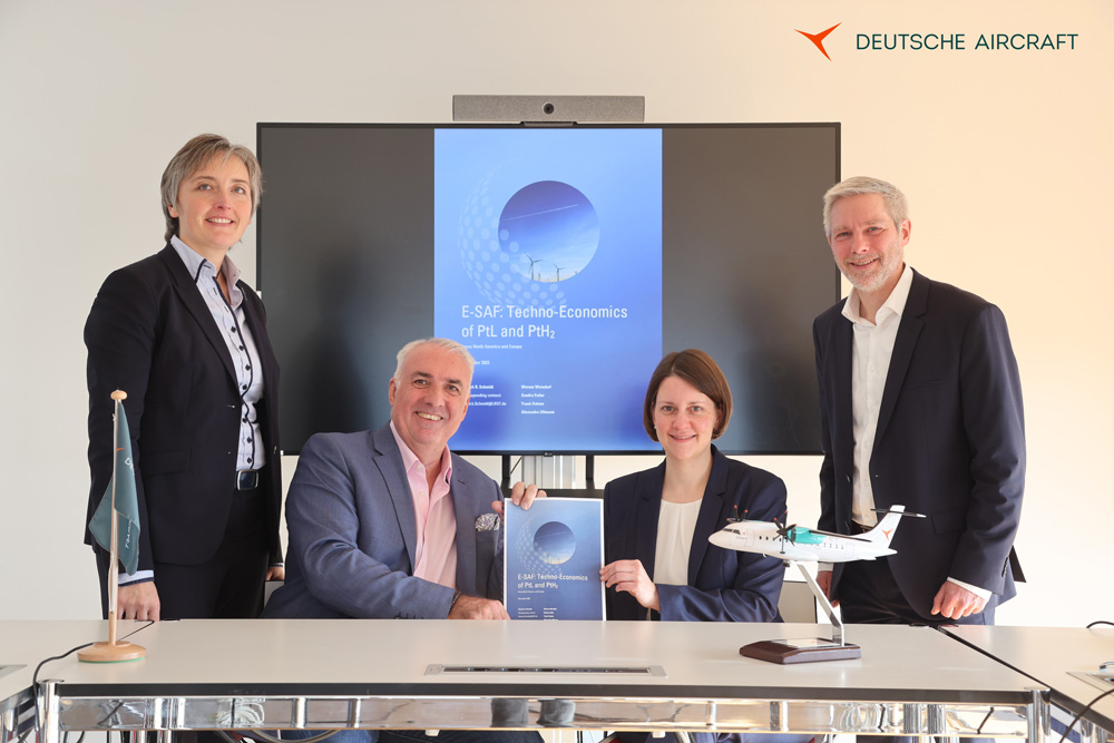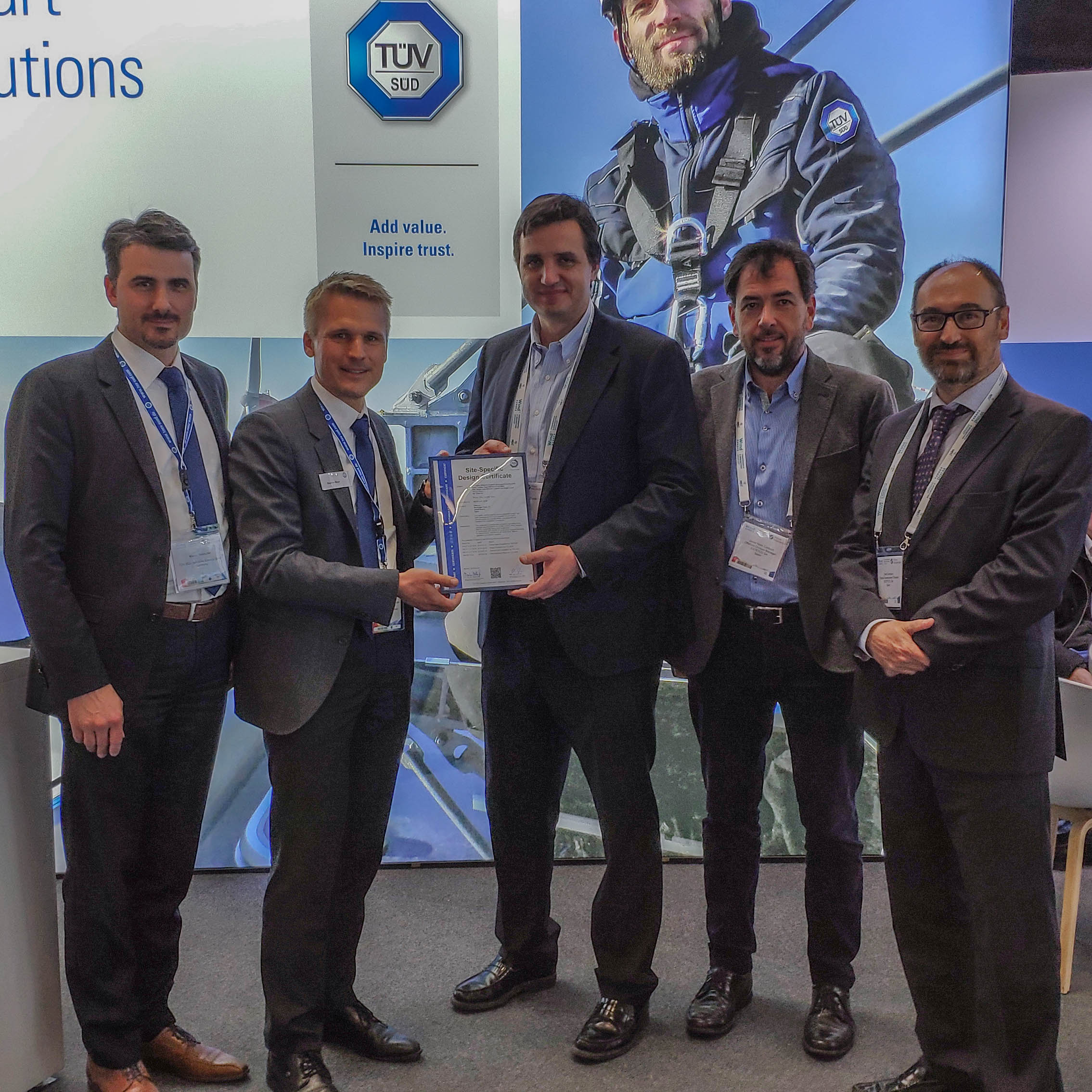 Bei der Zertifikatsübergabe auf der WindEurope in Bilbao (v.l.n.r.): Martin Webhofer, TÜV SÜD, Head of Wind Energy, Stepan Mayer, TÜV SÜD, Head of Tower, Foundation and Internals, José Serna, ESTEYCO, Chief Technology Officer (CTO), Javier Nieto, ESTEYCO, Offshore Division Manager, und David Sarrasin, ESTEYCO, Product Development Director