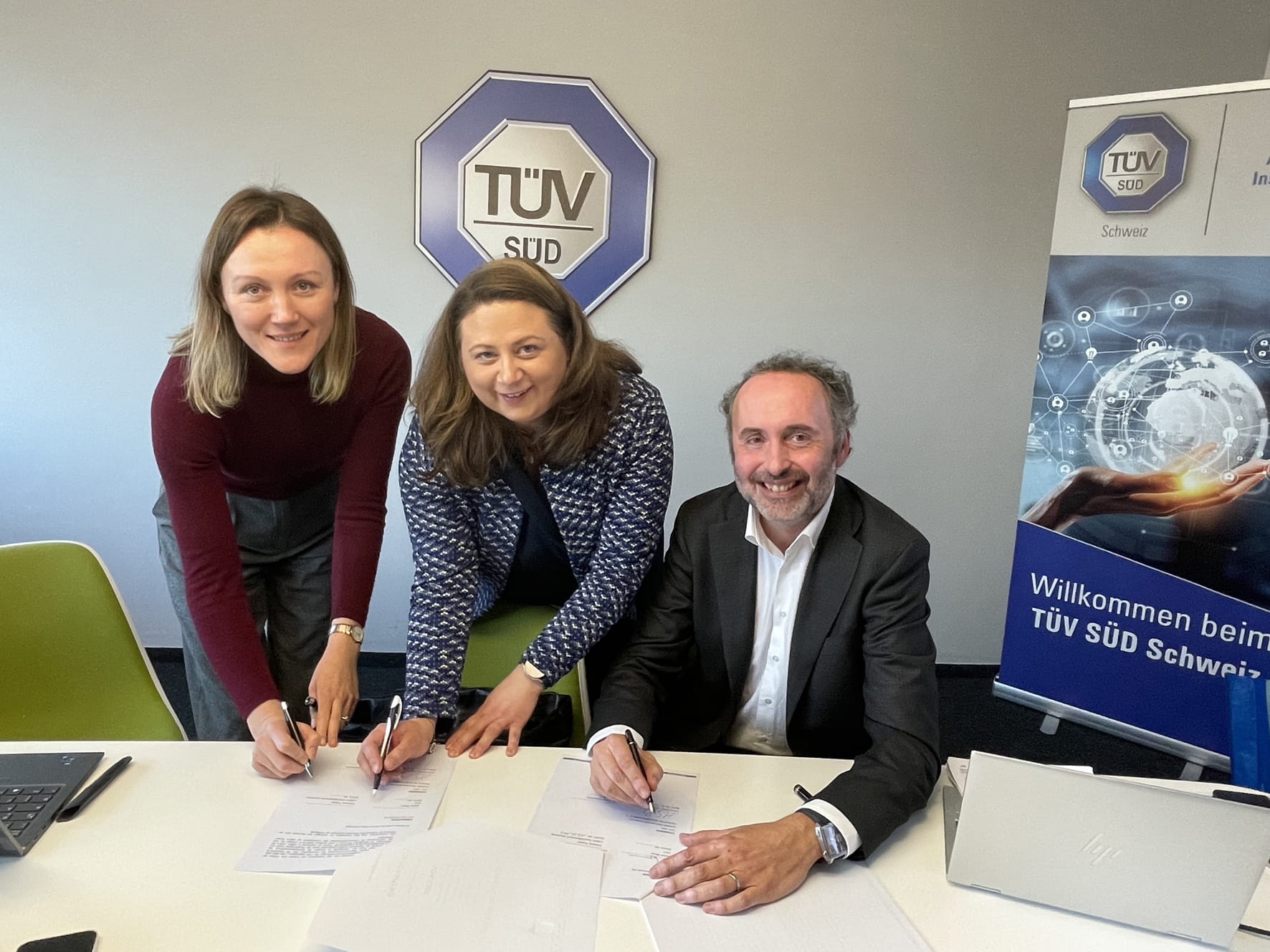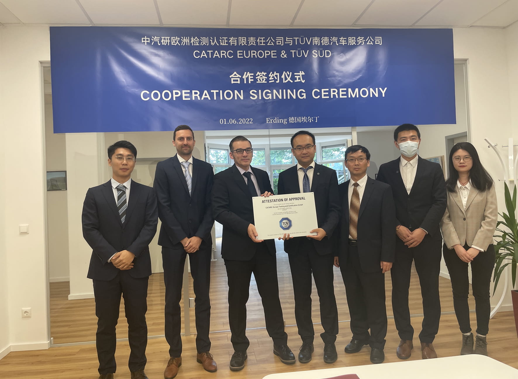 Freuen sich auf die Zusammenarbeit: Xinke Zhang, Manager Strategic project TÜV SÜD Mobility, Stefan Merkl, Vice President Automotive TÜV SÜD Mobility, Andreas Schäffler, Head of Automotive Germany TÜV SÜD Mobility, Guanqi Hao, Vice General Manager CATARC Europe, Bin Zhao, Chief Engineer CATARC Europe, Hongquan Wang, Project Manager CATARC Europe und Ling Li, Test Engineer CATARC Europe