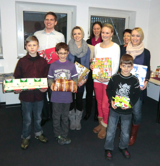 Geschenkübergabe für Kinder im Martin-Luther-Haus: Hintere Reihe (v.l.): Birgit Kretz vom Zentrum Aktiver Bürger und Margit Buhl, Leiterin der heilpädagogisch-therapeutischen Wohngruppen des Martin-Luther-Hauses. Mittlere Reihe: Die uniVersa-Azubis Sebastian Reichhart, Jasmin Gillich, Anna Gottmann und Kristina Schmehr. Vordere Reihe: Darijo, Erik und Bastian, Foto: uniVersa