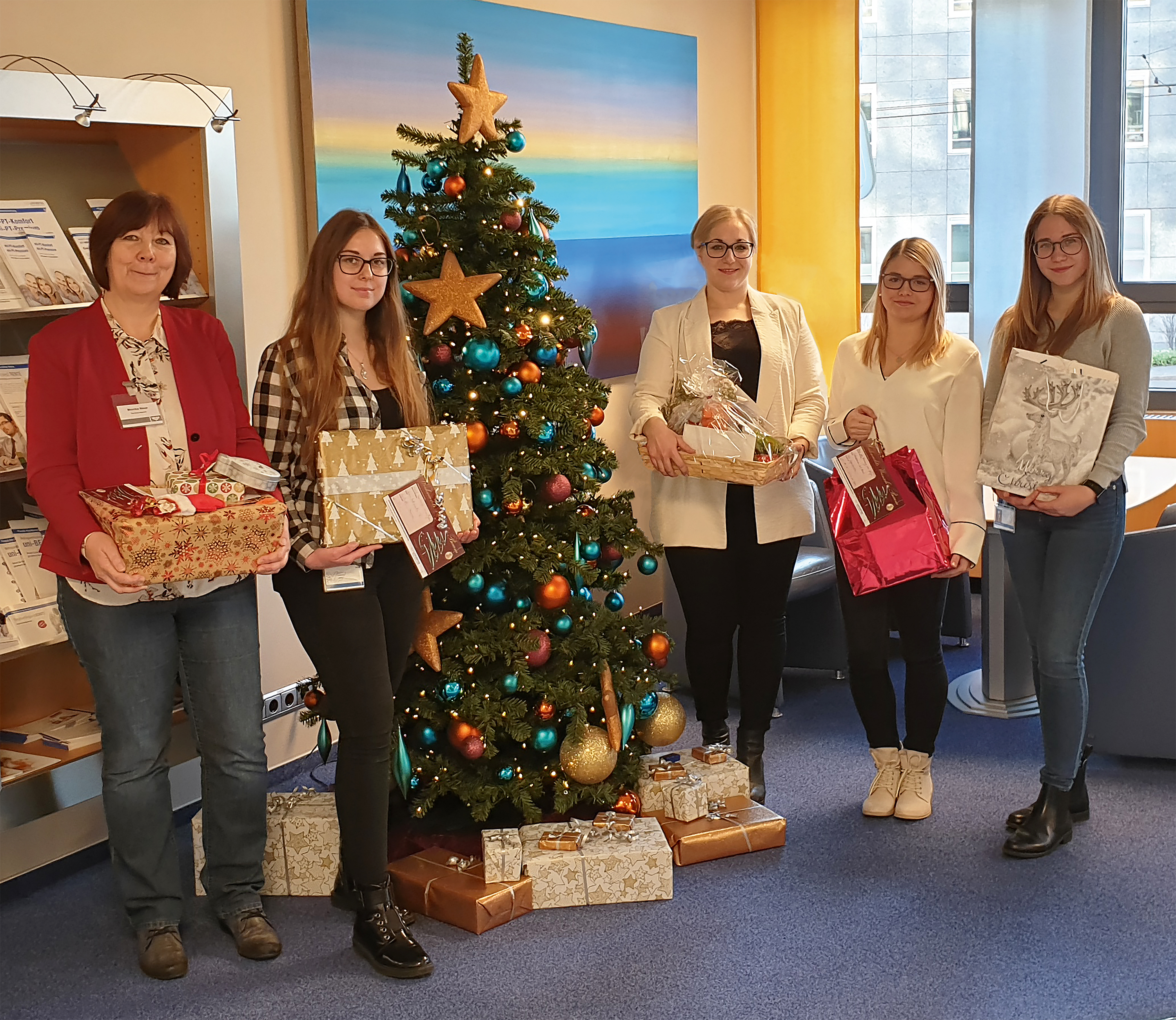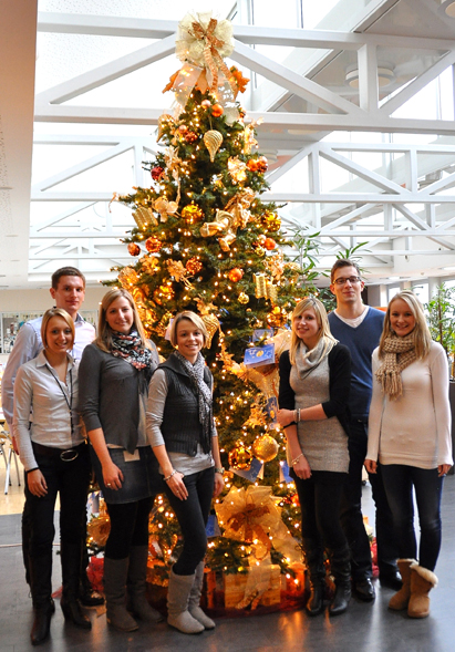Die Azubis bei der Übergabe der Weihnachtsgeschenke. Hintere Reihe v.l.n.r.: Laura Stauber, Sevgi Üstüner, Vanessa Voll, Niklas Ringler, Desiree Schade, Helen Pfahl, Emine Bilgi, André Bräsick / Foto: uniVersa