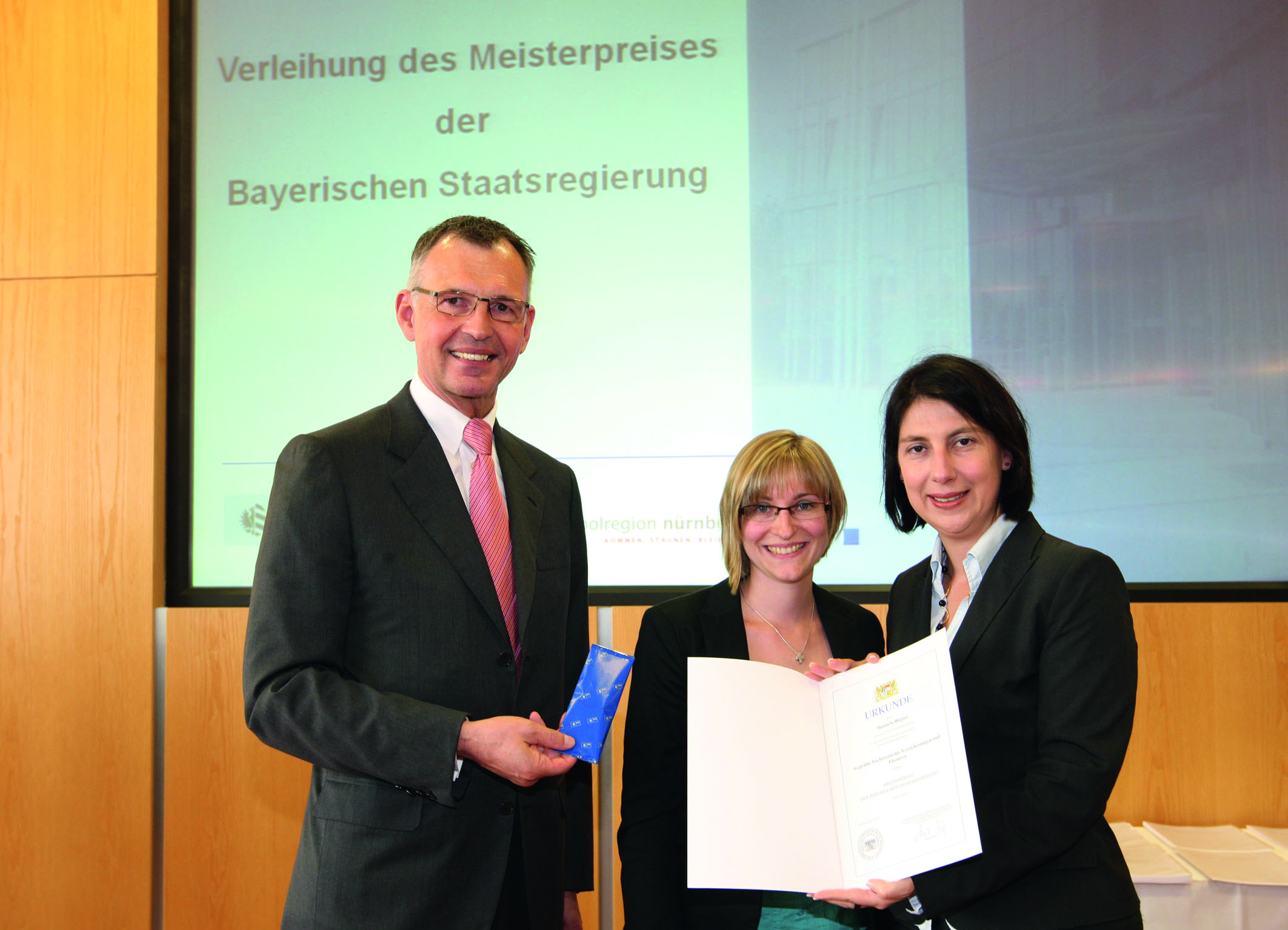 Meisterpreis der Bayerischen Staatsregierung: Überreichung durch IHK-Präsident Dirk von Vopelius (li.) und Dr. Gert Bruckner, Ministerialdirigent im Bayerischen Wirtschaftsministerium (re.) an Kristina Schmehr (Bild 1), Sebastian Reichhart (Bild 2) und Jasmin Johnscher (Bild 3) / Foto: IHK Nürnberg / Kurt Fuchs
