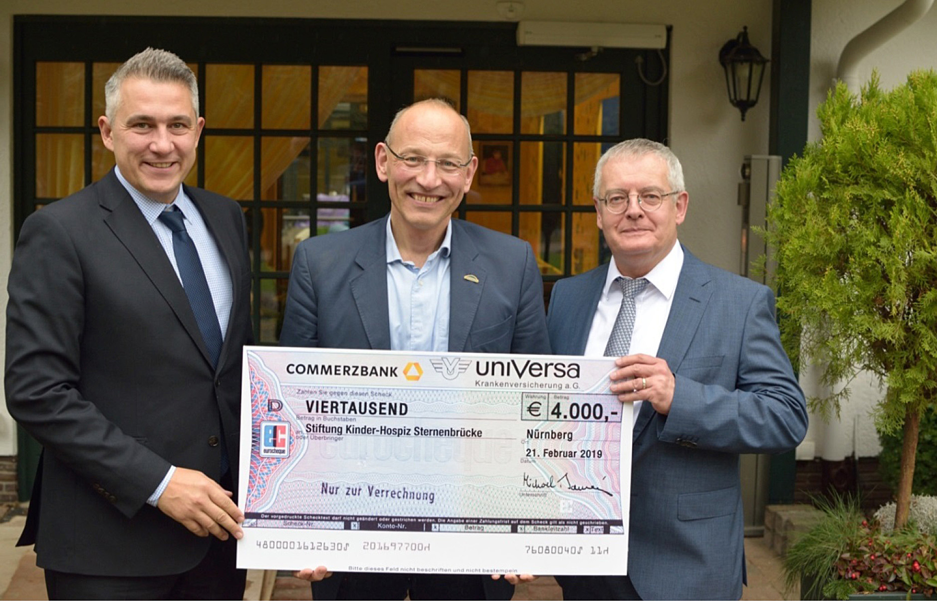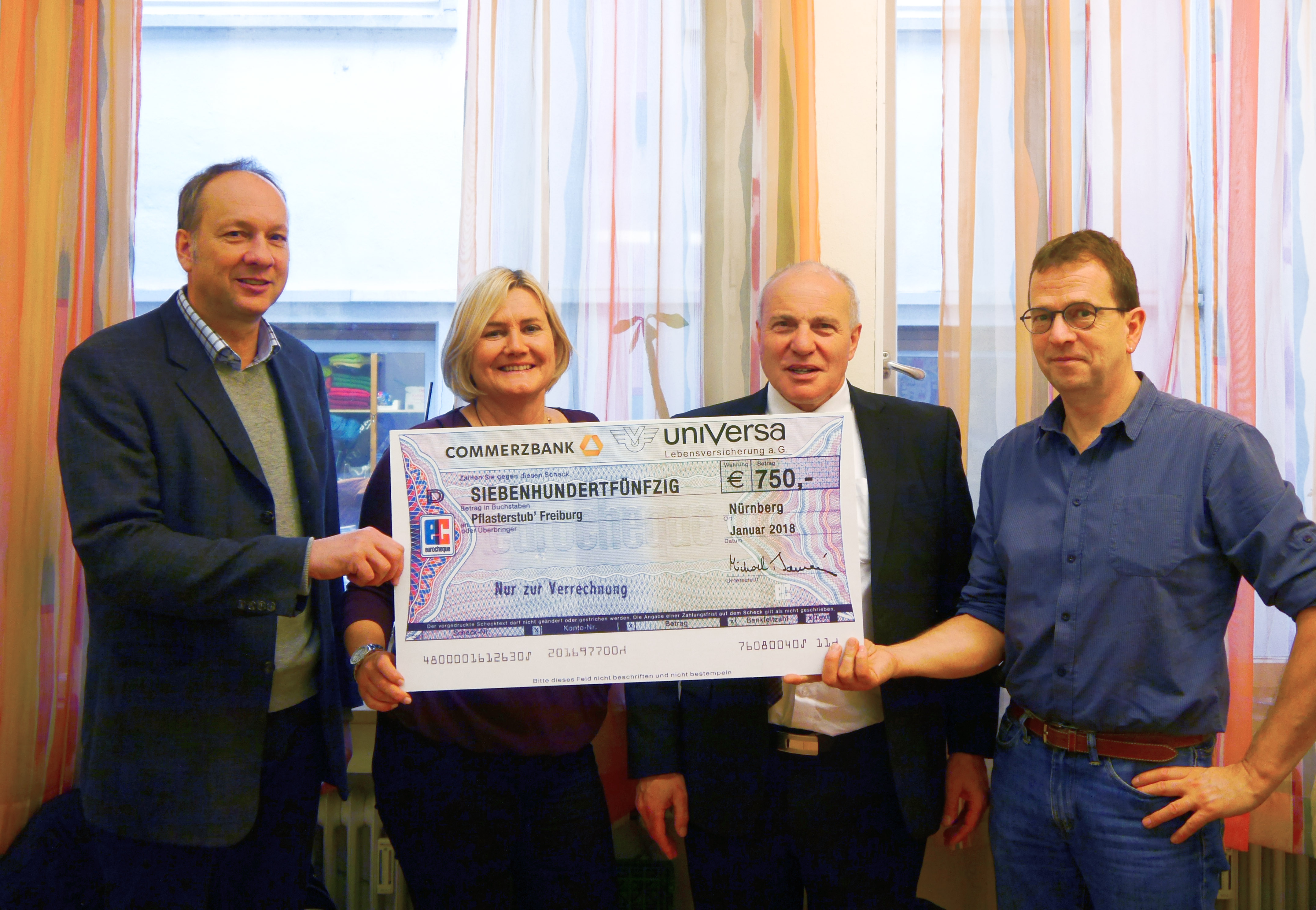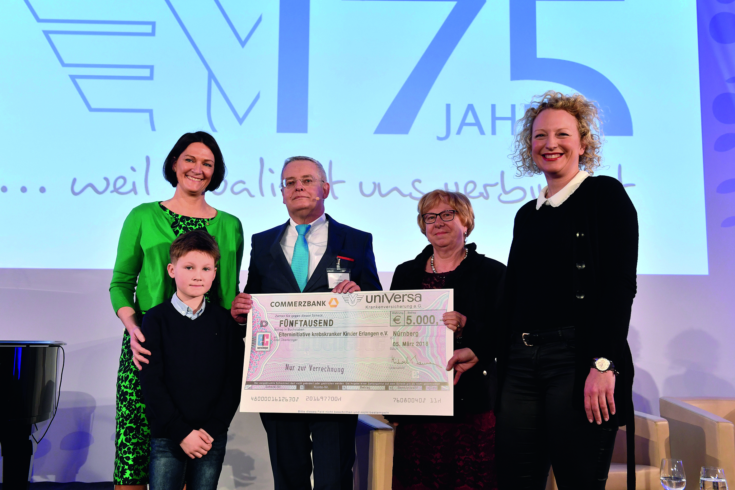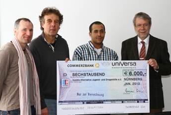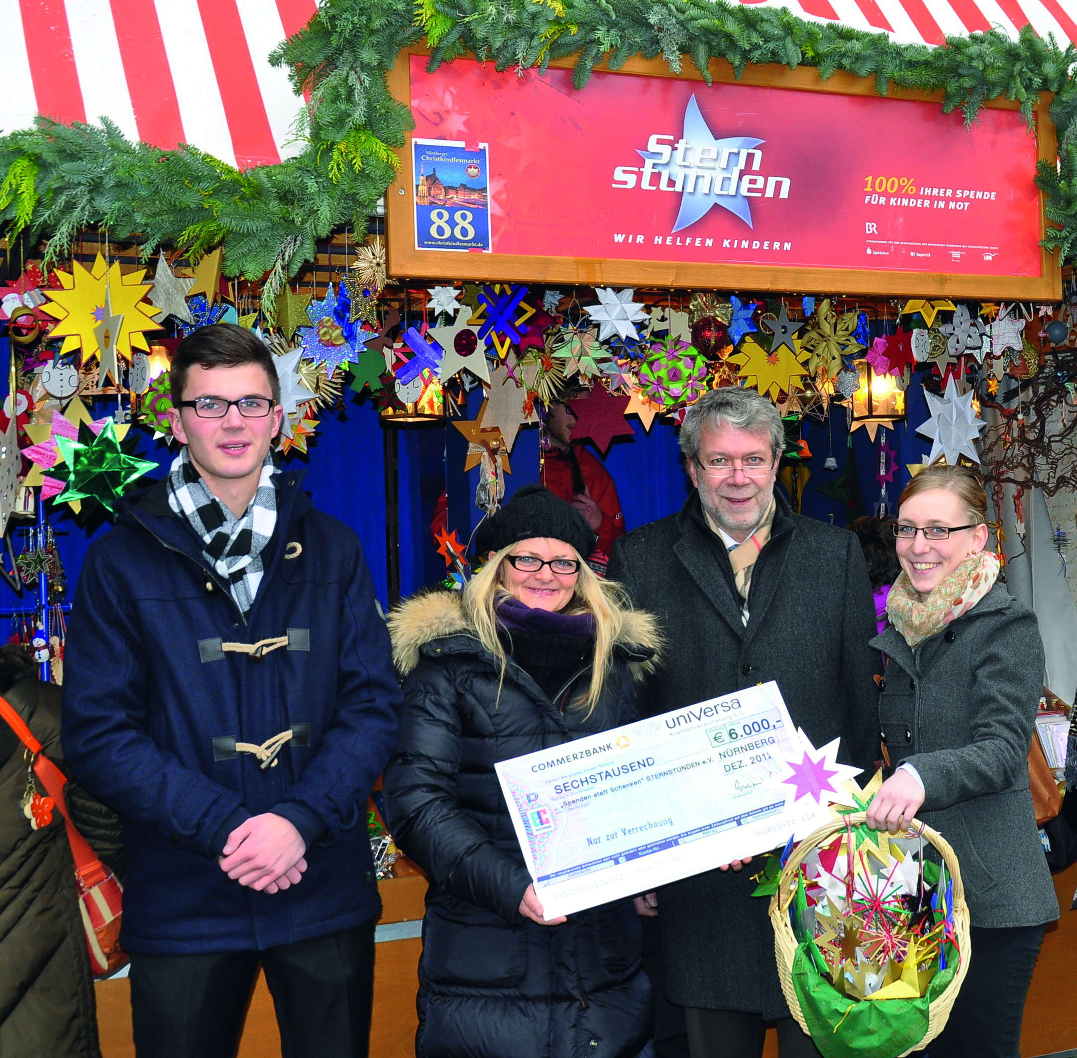 uniVersa-Vorstandsvorsitzender Gerhard Glatz (Zweiter von rechts) übergibt an Sabine Krombholz (Zweite von links) einen Spendenscheck über 6.000 Euro; daneben die beiden Auszubildenden Daniel Fischer und Lena Mosch mit selbst gebastelten Sternen.