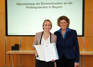 Überreichung durch IHK-Präsident Dirk von Vopelius (li.) und Dr. Gert Bruckner, Ministerialdirigent im Bayerischen Wirtschaftsministerium (re.) an Lena Mosch. Foto: IHK / Fuchs