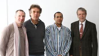 (v. l.) Metallbaukünstler Stefan Vogel, mudra-Geschäftsführer Bertram Wehner, Sven aus der Drogentherapie und uniVersa-Vorstandsvorsitzender Gerhard Glatz