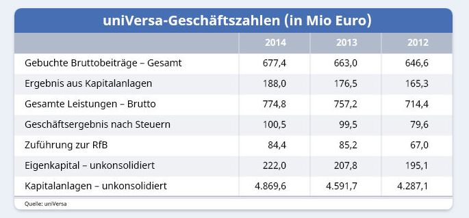 Die uniVersa konnte im Geschäftsjahr 2014 ihre Bruttobeitragseinnahmen um 2,2 Prozent auf 677,4 Millionen Euro steigern. Aus den Kapitalanlagen wurde ein Ergebnis von 188,0 Millionen Euro (Vorjahr: 176,5) erwirtschaftet. Der Bestand an Kapitalanlagen stieg auf 4.869,6 Millionen Euro. Die Leistungsausgaben wuchsen um 2,3 Prozent auf 774,8 Millionen Euro. Unter dem Strich verblieb ein Geschäftsergebnis nach Steuern von 100,5 Millionen Euro (Vorjahr 99,5). Davon wurden der Rückstellung für Beitragsrückerstattung (RfB), die den Versicherten zugutekommt, 84,4 Millionen Euro zugeführt. Das Eigenkapital konnte um 6,8 Prozent auf 222,0 Millionen Euro gesteigert werden. Vorstandsvorsitzender Gerhard Glatz zeigt sich zufrieden: „Wir konnten in einem schwierigen Marktumfeld weiter spartenübergreifend zulegen und unsere Eigenkapitalstärke ausbauen“. Diese sei gerade im derzeitigen Niedrigzinsumfeld ein zunehmend wichtiger Gradmesser und ein besonderes Qualitätsmerkmal bei langlaufenden Verträgen wie der Kranken- und Lebensversicherung, so Glatz.