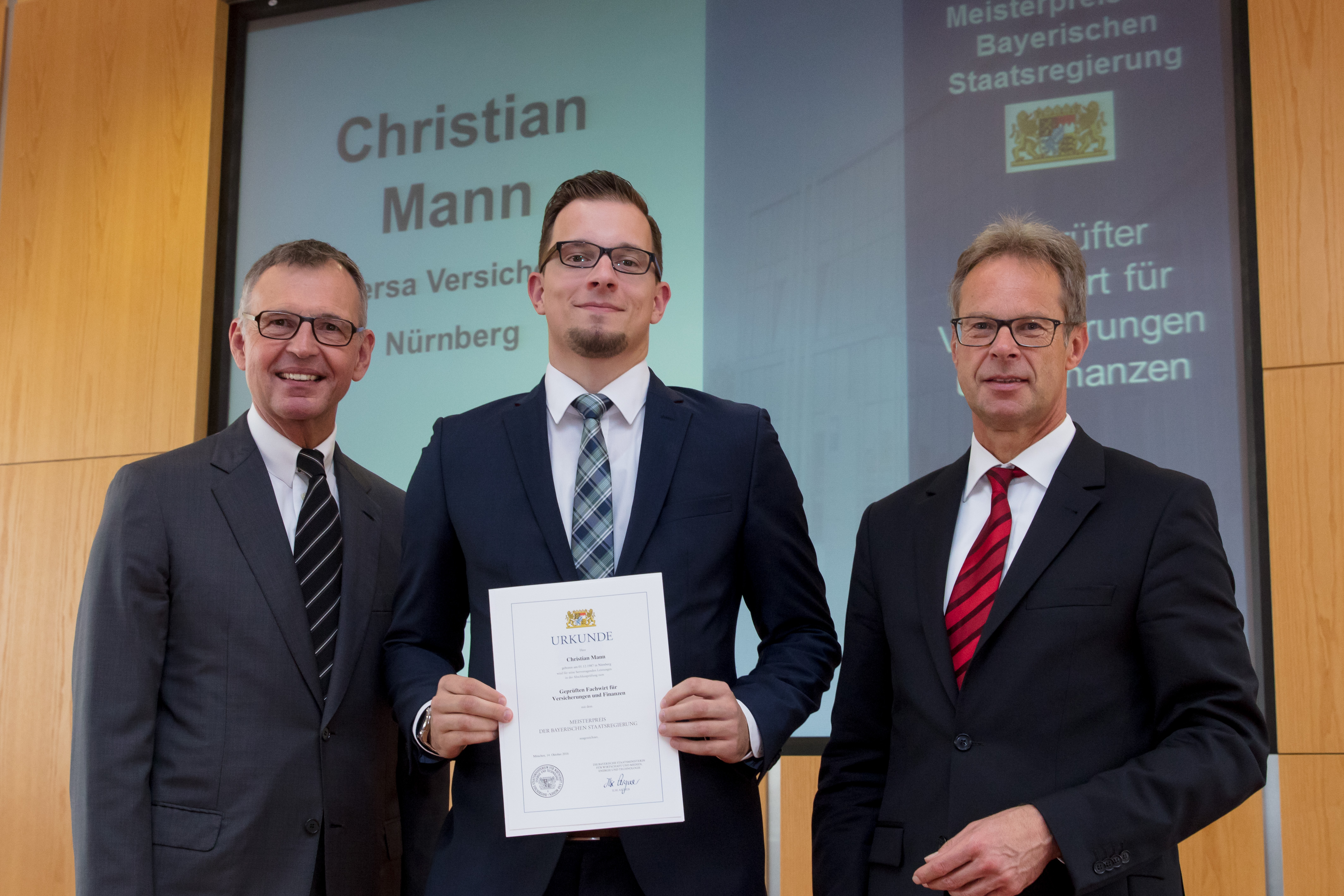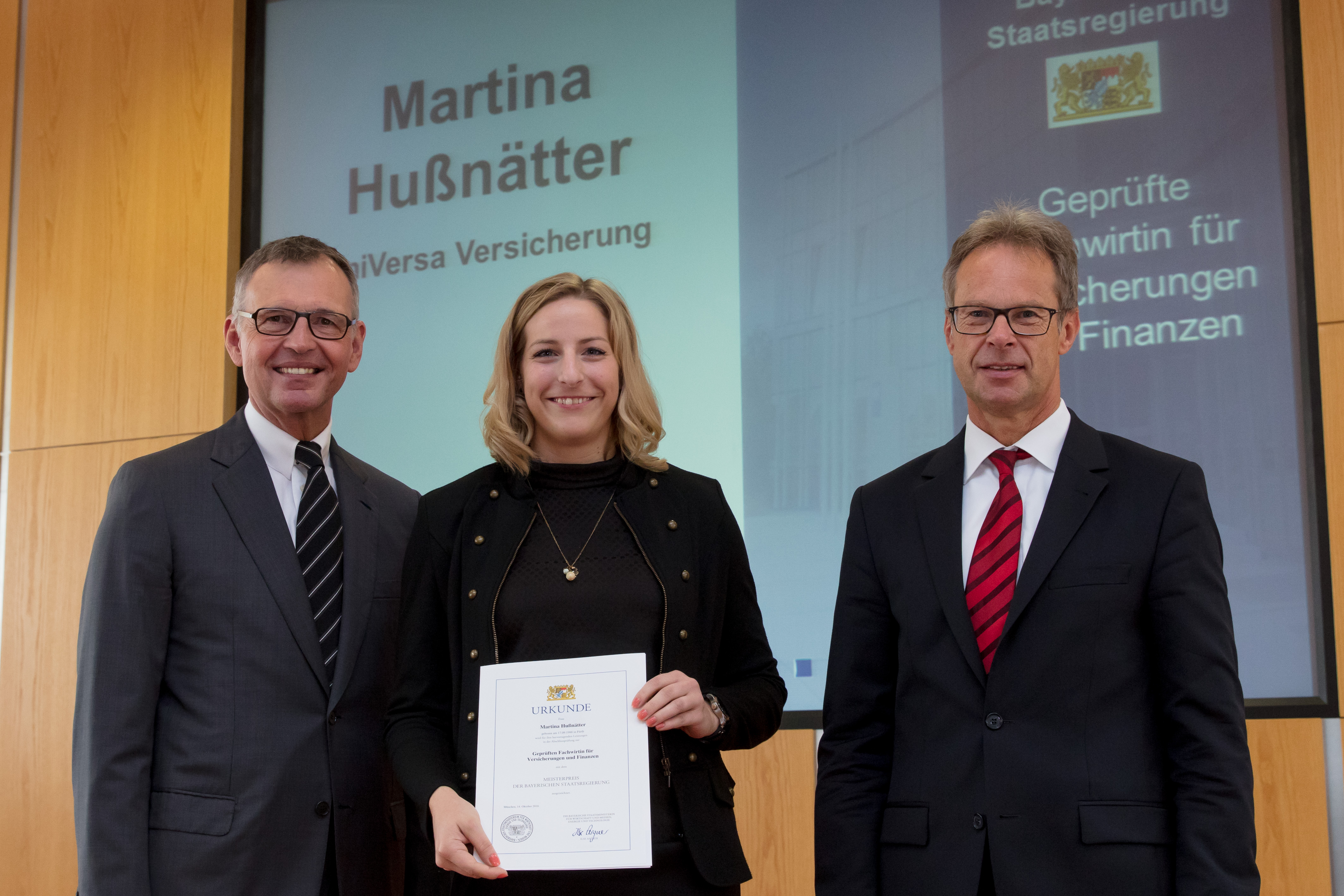 (lifepr) (Nürnberg, 18.10.2016) Gleich drei Mitarbeiter der uniVersa Versicherungsunternehmen wurden für ihre besonders erfolgreich abgeschlossene Weiterbildung mit dem „Meisterpreis der Bayerischen Staatsregierung" ausgezeichnet. Den Meisterpreis erhält, wer zu den 20 Prozent der Prüfungsbesten bei den IHK-Fortbildungen gehört. Als prüfungsbeste Fachwirtin für Versicherungen und Finanzen wurde Lena Mosch mit der Gesamtnote 1,4 geehrt. Neben ihr erhielten auch Martina Hußnätter und Christian Mann als Fachwirte für Versicherungen und Finanzen den Meisterpreis von Dr. Gert Bruckner, Ministerialdirigent im Bayerischen Wirtschaftsministerium, und von Dirk von Vopelius, Präsident der IHK Nürnberg für Mittelfranken, überreicht. Die Auszeichnung soll die Attraktivität der beruflichen Bildung und die Bedeutung der Weiterbildung unterstreichen.