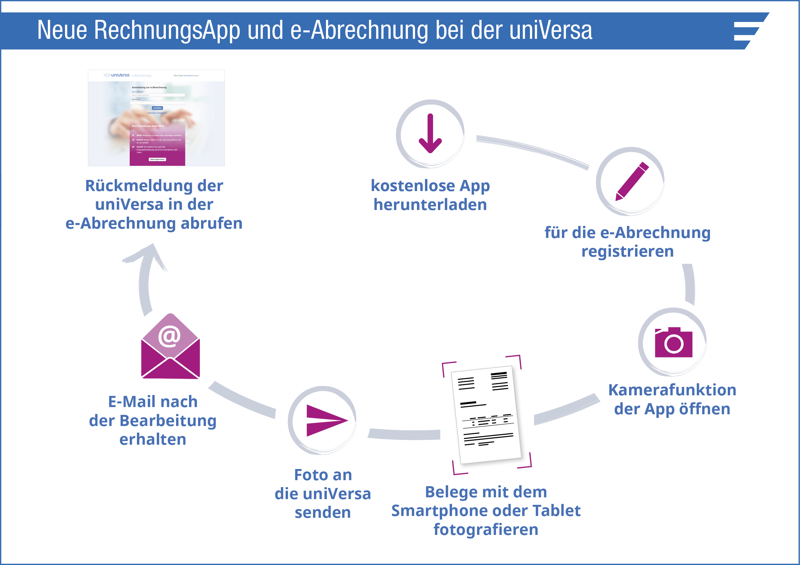 (lifepr) (Nürnberg, 15.02.2017) Kunden der uniVersa Krankenversicherung können ihre Rechnungen ab sofort über eine App per Smartphone oder Tablet fotografieren und einreichen. Die Leistungsabrechnung erfolgt mit Besserstellungsprüfung ebenfalls elektronisch in dem neuen Onlineportal e-Abrechnung.