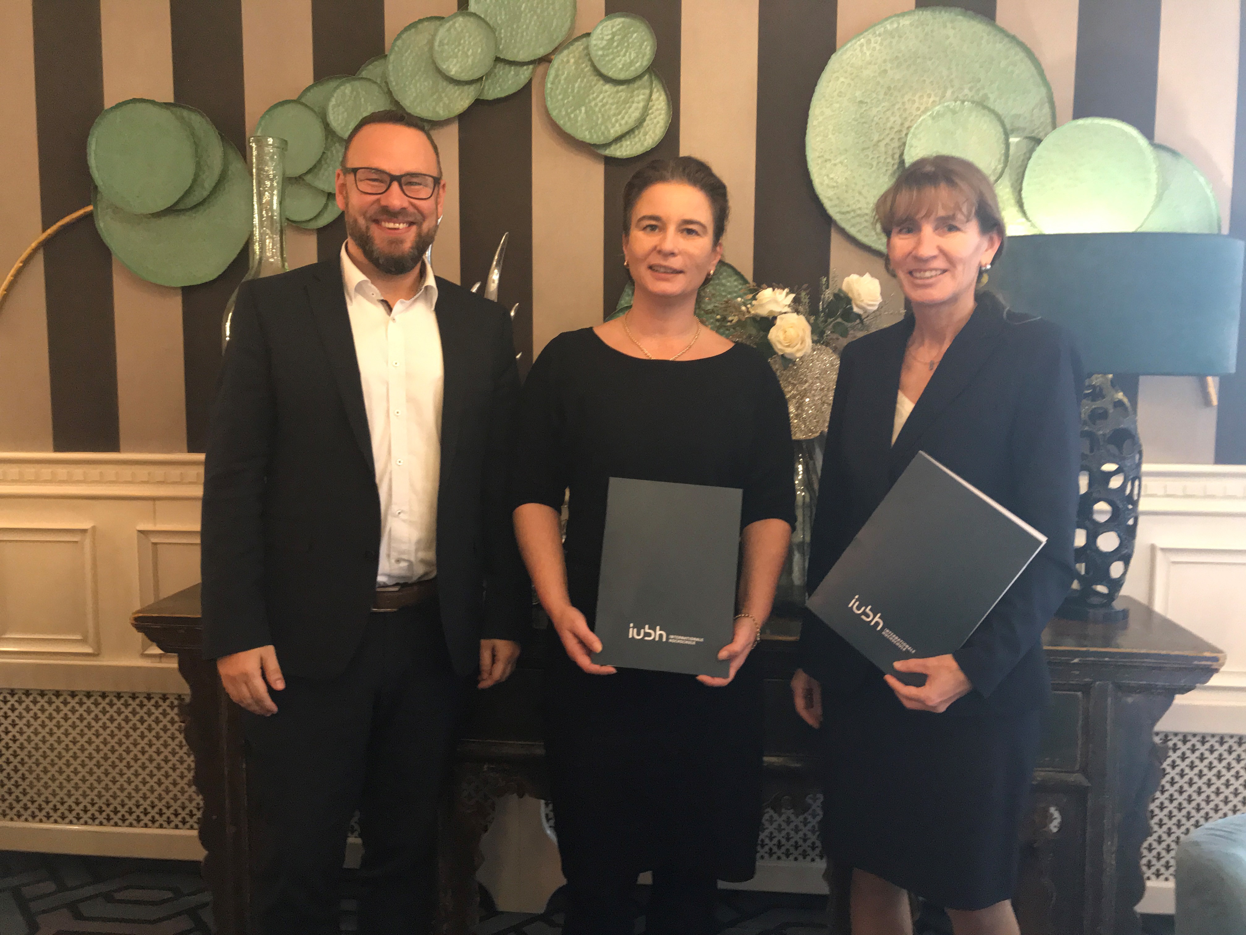 Studienberater Falco Birkheuer, Melanie van Kranen sowie Campusleiterin Sabine Walther-Eising bei der Vertragsunterzeichnung in Moers (NRW). (v.l.n.r.) / Quelle VdV/IUBH